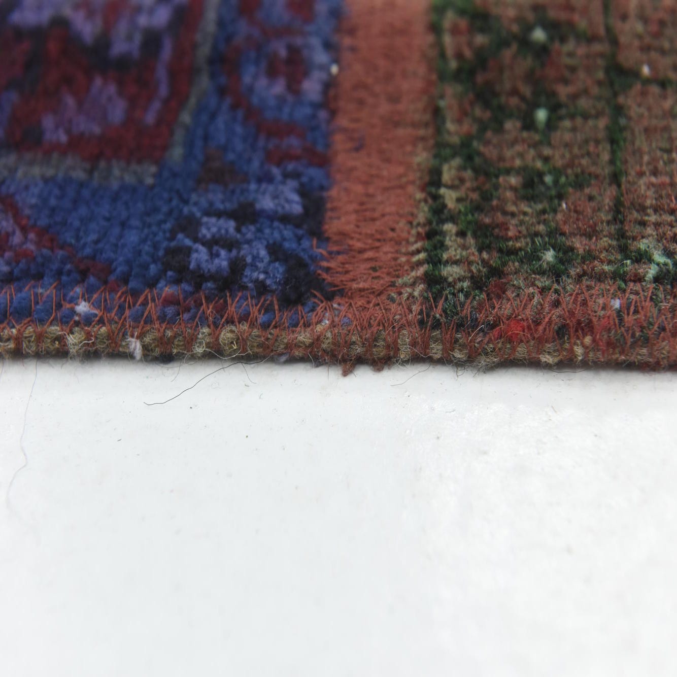 A hand-knotted 100% wool rug that reads like a curated patchwork of vintage fragments—floral arabesques, small medallions, lattice bands and softened field panels arranged in rectangular segments. The multi background provides a rich stage for jewel- and earth-toned accents: navy blue and blue, mossy green, ivory highlights, bright orange and red notes, and pops of violet and pink. Running your hand across the surface you feel a soft, dense pile with subtle variations in height and color; a low-luster finish and gently distressed areas give the rug a tactile, lived-in character.