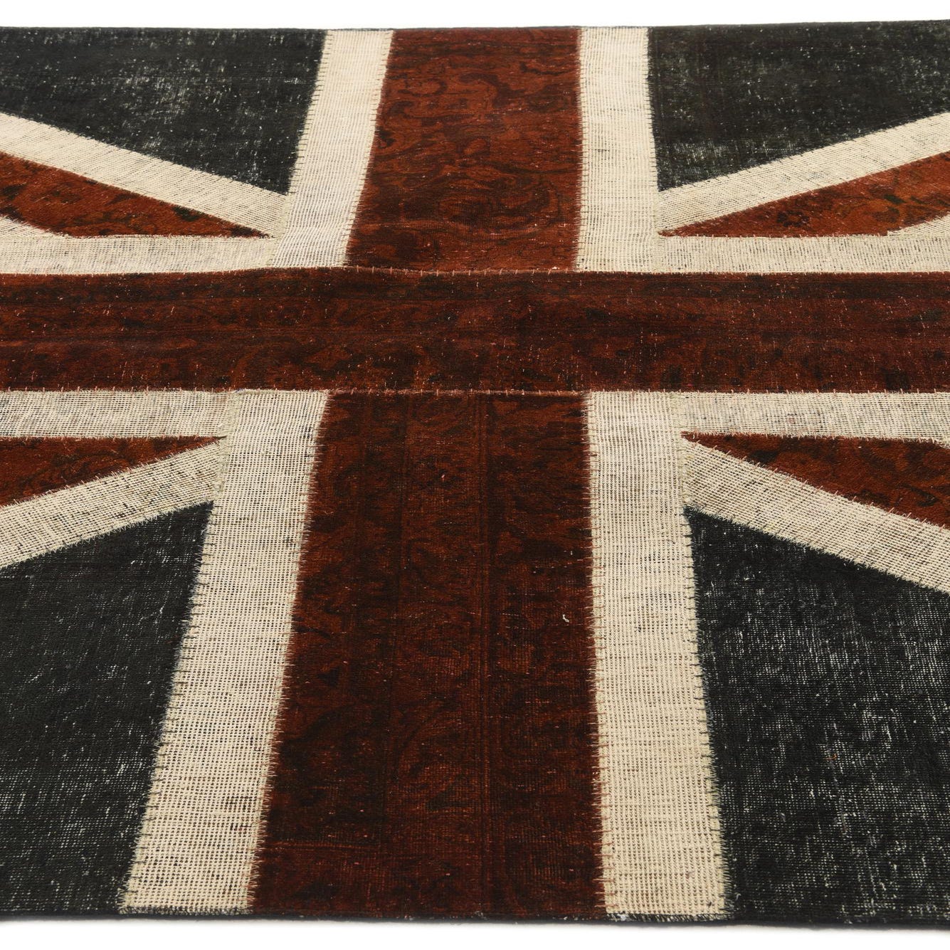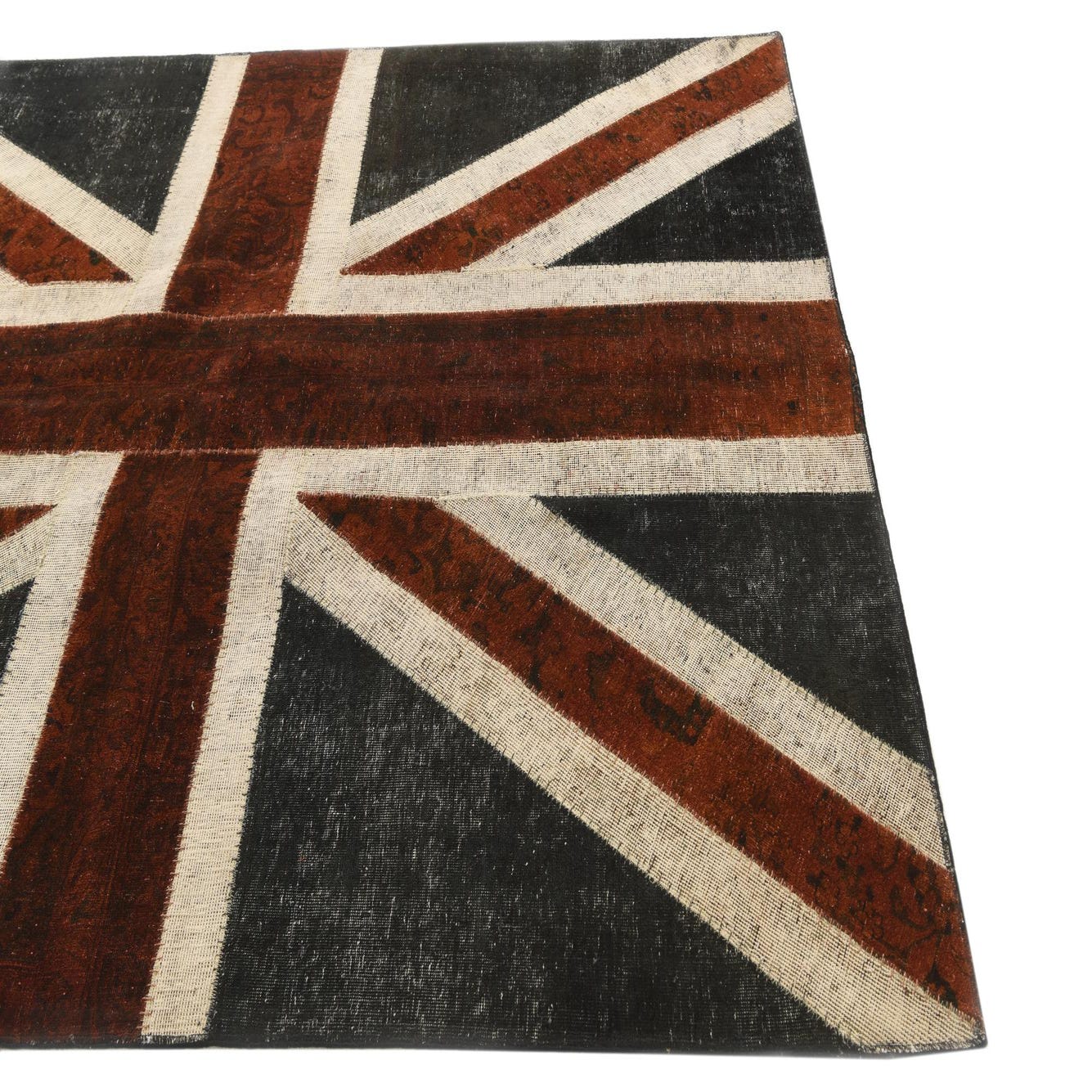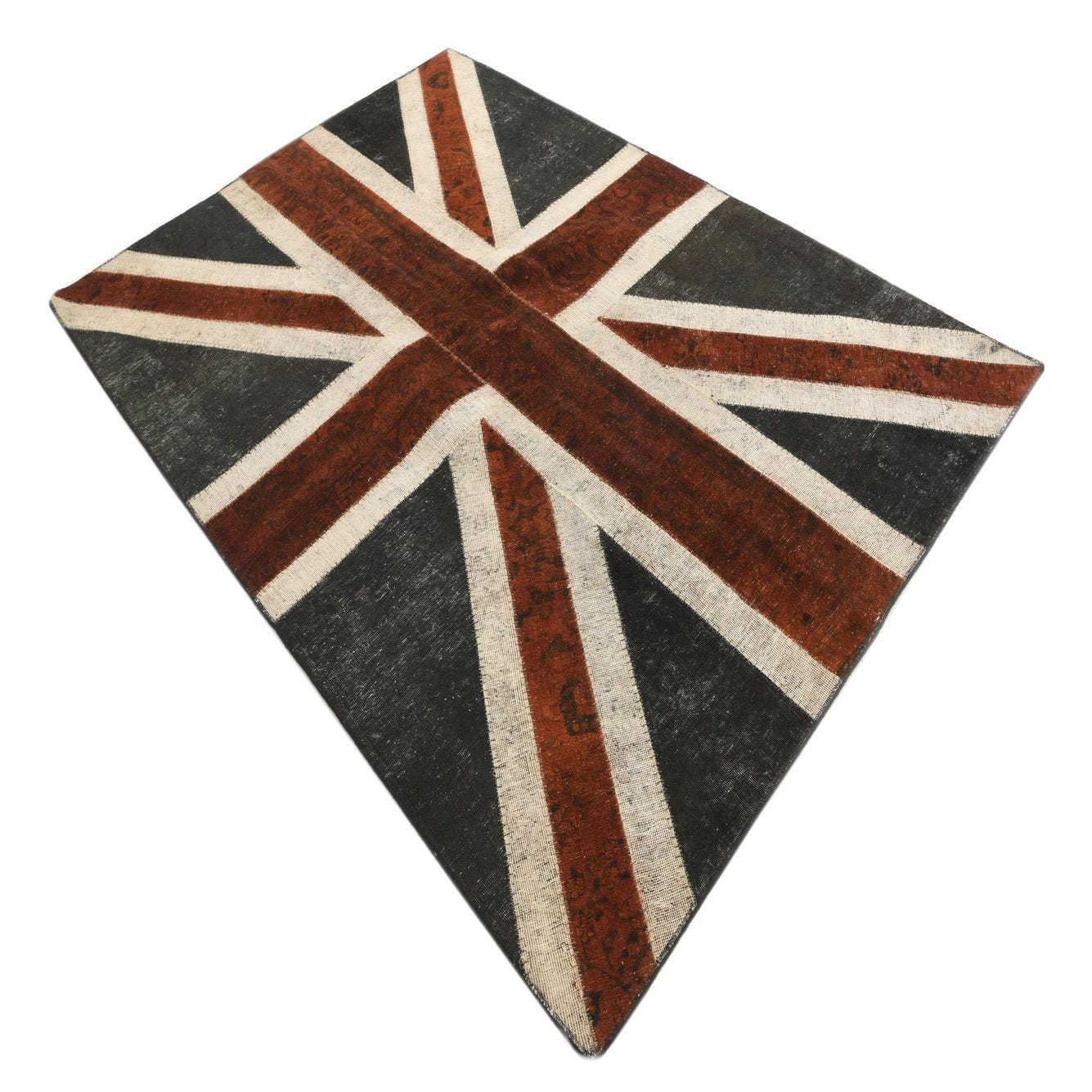 A 5x8 rectangular rug featuring a distressed Union Jack flag design in multi-colored hues, suitable for a living room.