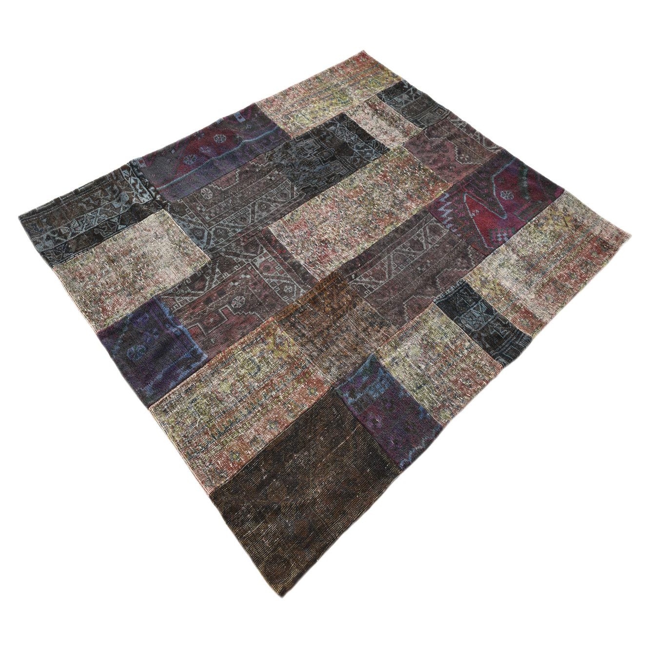 This Ultra Vintage collection rug is a 5x8 hand-knotted piece crafted from 100% wool, presenting a rich tapestry of colors that include multi-tonal shades of black, blue, brown, burgundy, ivory, light blue, rust red, navy blue, and maroon set against a multi-colored background. The pattern features an eclectic patchwork of traditional motifs, each section boasting a unique design with variations in hue and form, creating an ensemble that is both cohesive and visually stimulating.