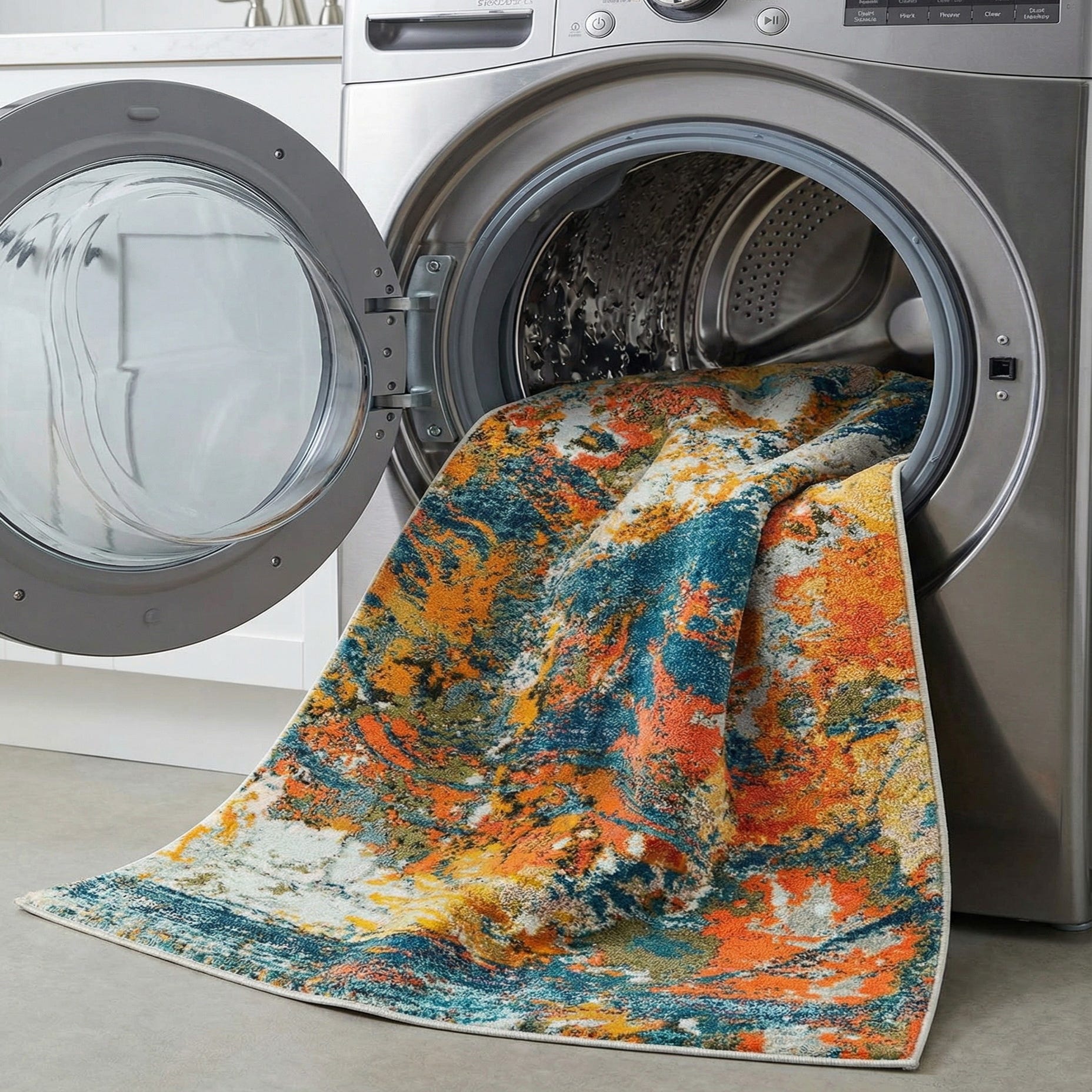 A 5x8 rectangular multi-colored abstract rug featuring vibrant splashes of orange, blue, yellow, and white, suitable for a modern living room.