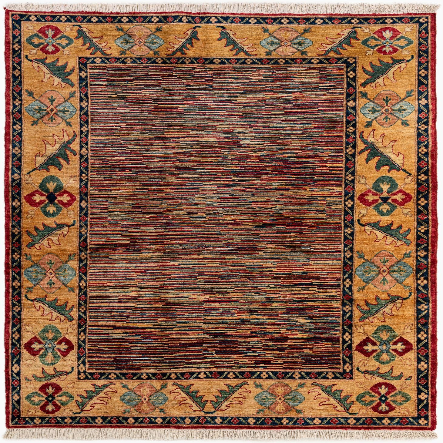 A 5x8 rectangular multi-colored Oriental rug featuring a striped center and a gold border with floral and geometric motifs, ideal for a living room.