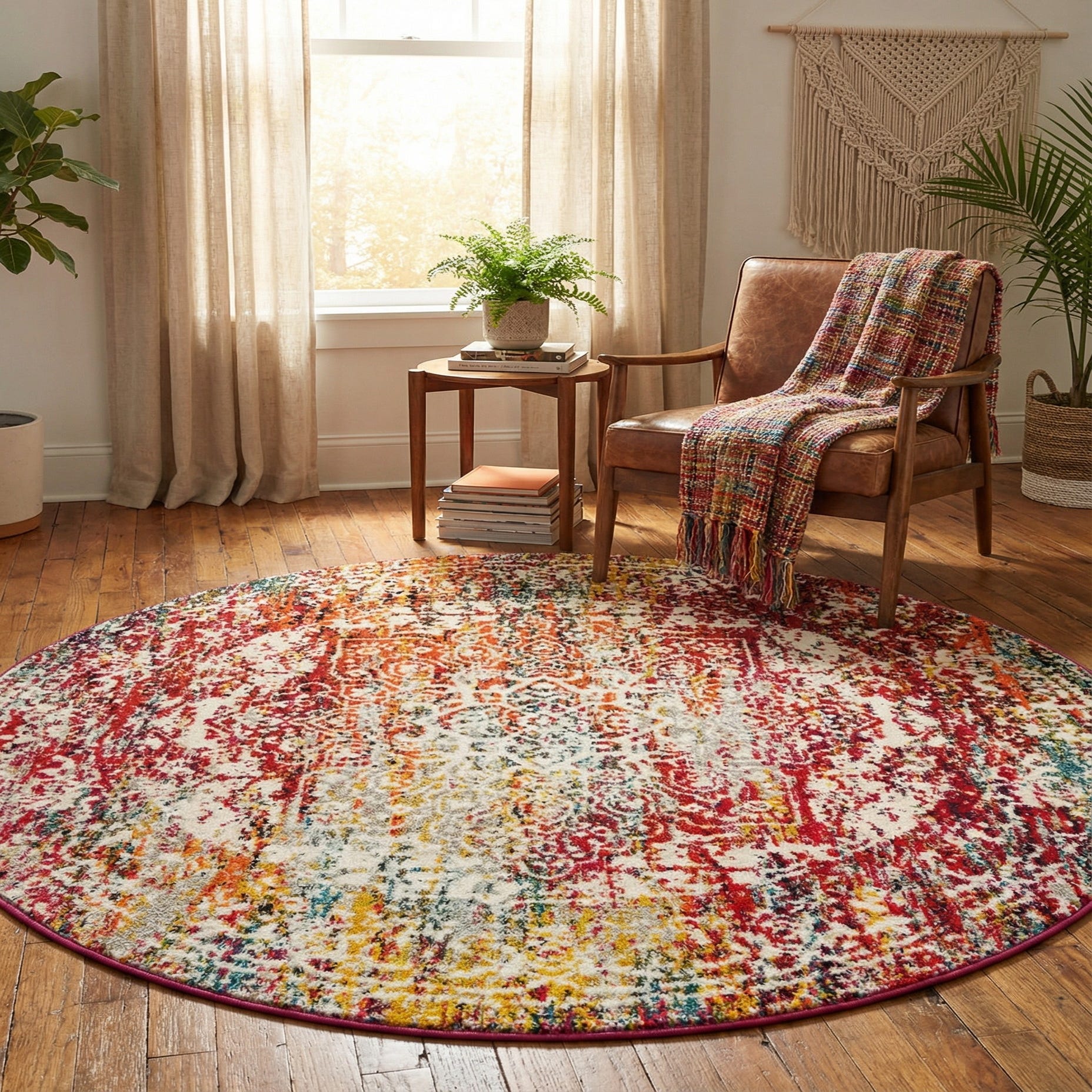 This round rug presents a distressed medallion pattern with a painterly, lived-in look. A multi background frames an ivory-centered motif while rich tones of red, orange and yellow layer over subtle accents of gray, black and teal for added depth. The overall effect balances vintage-inspired ornament with a modern, abstract finish that reads lively without overwhelming a room.