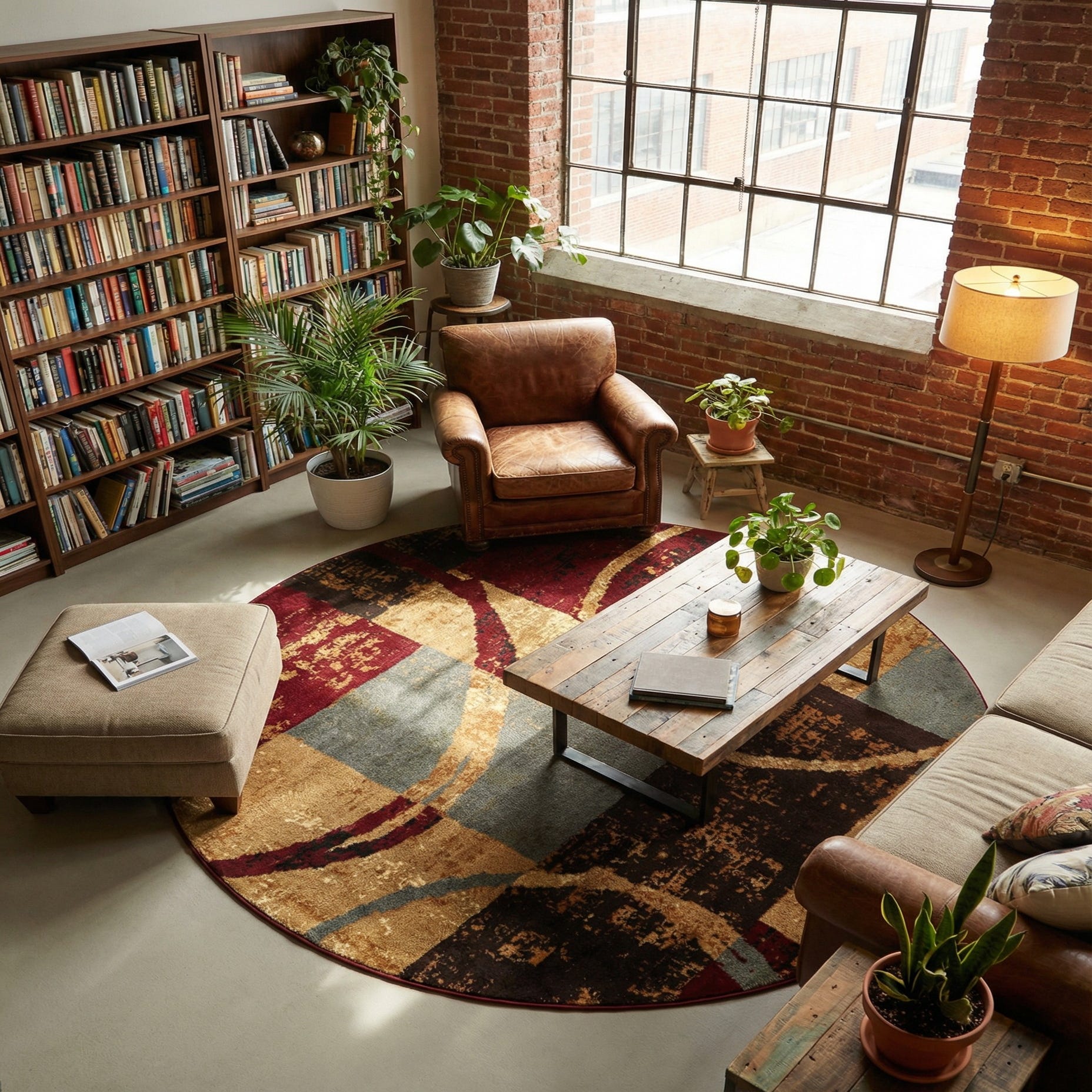 Machine-made from 100% polypropylene, the pile is low and even with a smooth, slightly dense hand that feels comfortable underfoot while maintaining crisp pattern definition. Place it beneath a round dining table to reinforce the shape of the room, use it to anchor a seating group with warm wood and leather furnishings, or set it in a home office or den to introduce color and movement without overwhelming other finishes. It pairs especially well with mid-century pieces, industrial metals, or neutral upholstery.