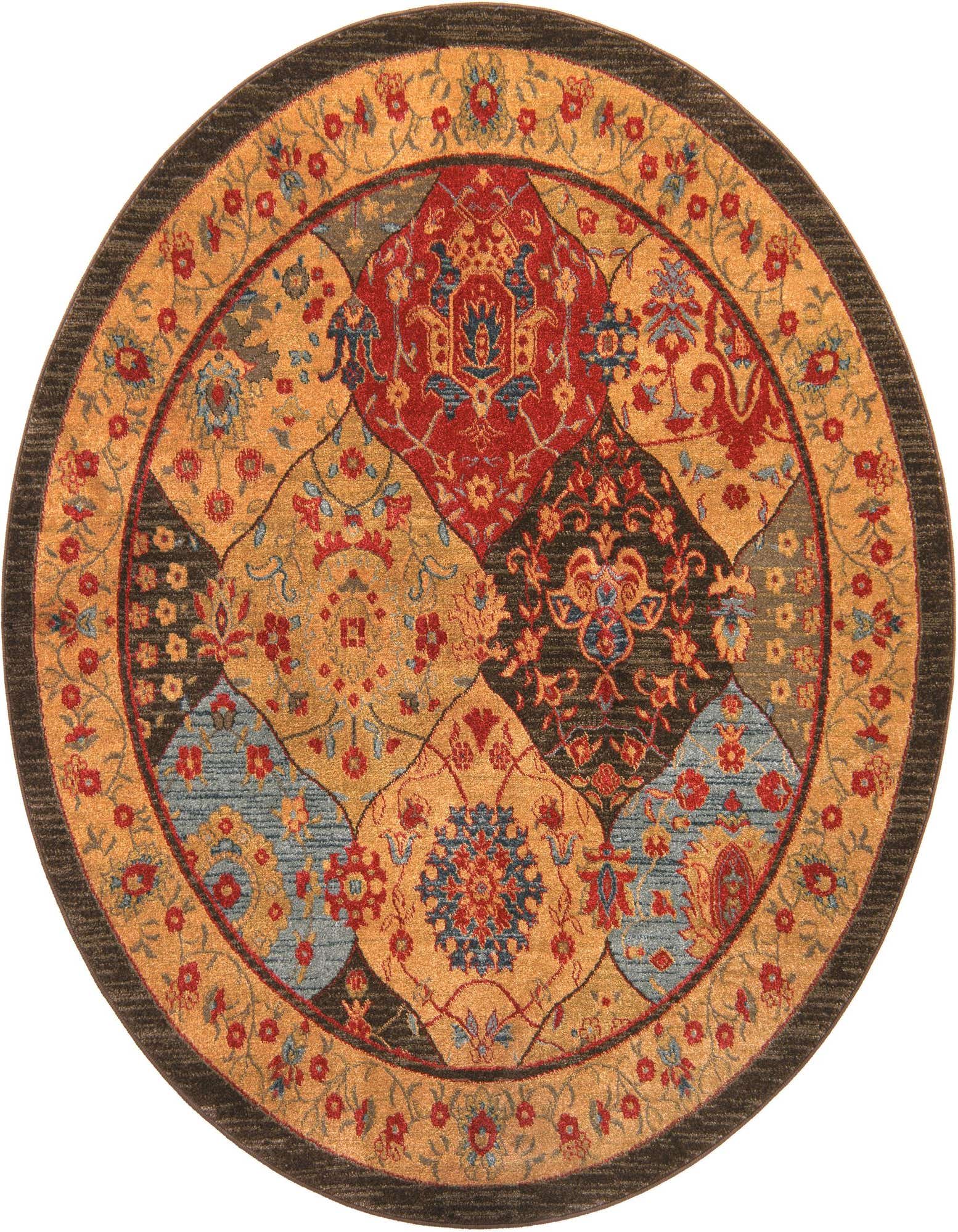 The Chelsea Collection offers a 6 Ft Round rug machine woven from 100% polypropylene, ensuring durability and ease of maintenance. The design plays harmoniously with a rich palette, featuring shades of tan, brown, red, olive, blue, and navy blue on a multi-colored background. This rug showcases a traditional motif with intricate patterns and floral elements, creating a sense of timeless elegance.