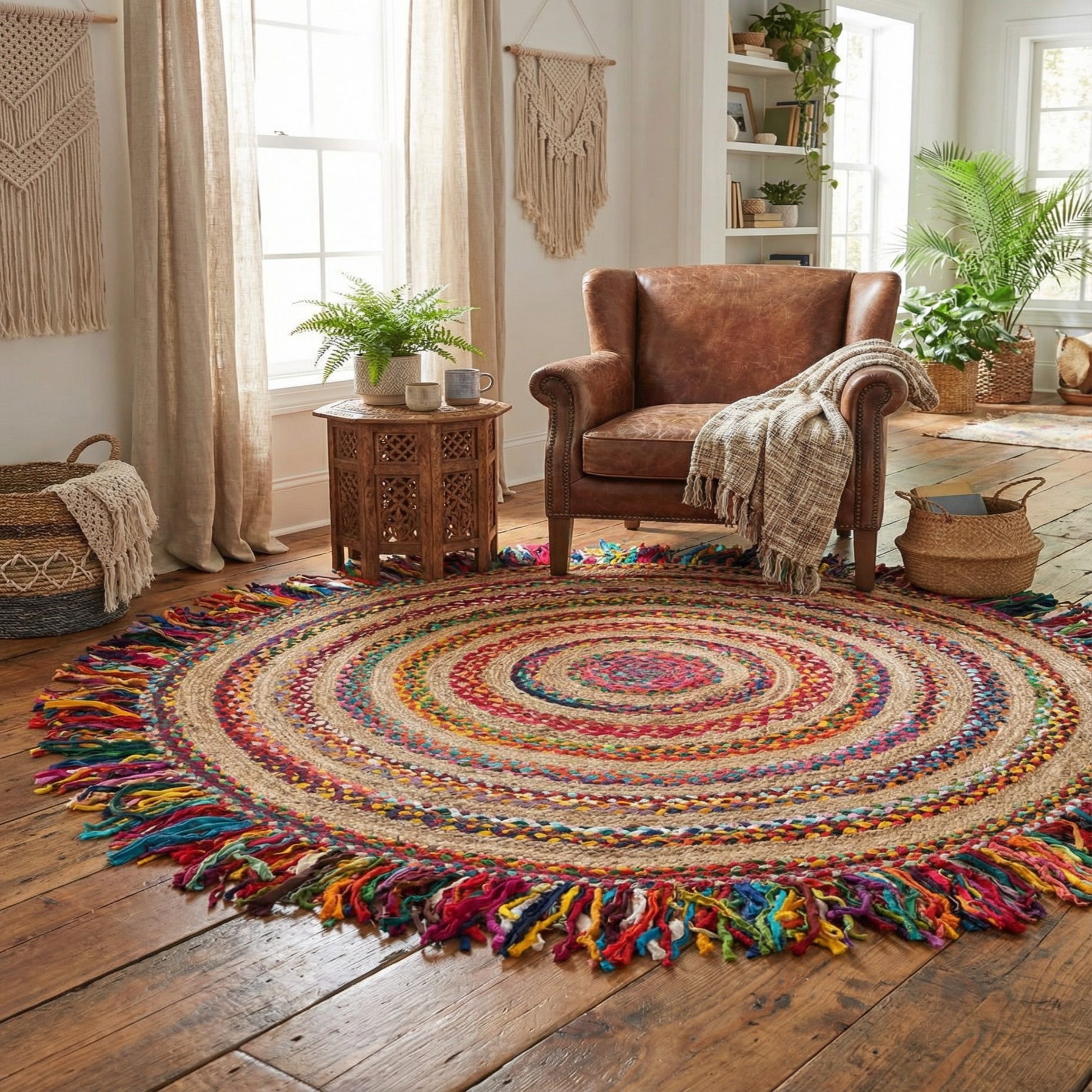 The texture of the rug is emphasized by its flatweave construction, which provides a smooth, durable surface. Its circular pattern is a result of the hand-braided technique, giving it a unique, artisanal quality. The use of jute and recycled materials not only adds to the rug's textural interest but also contributes to its sustainability.