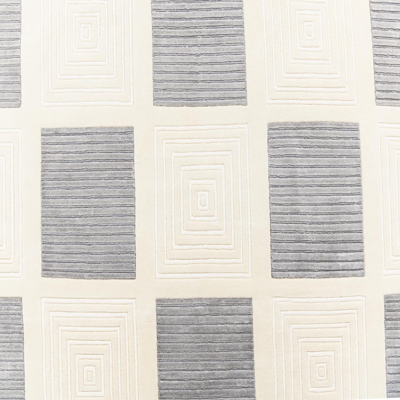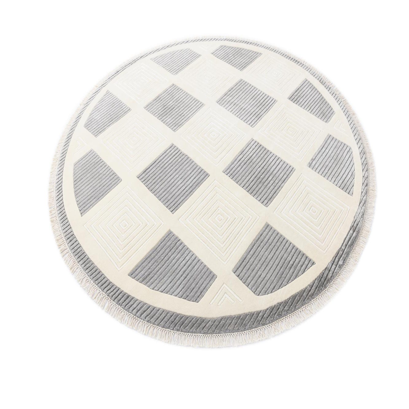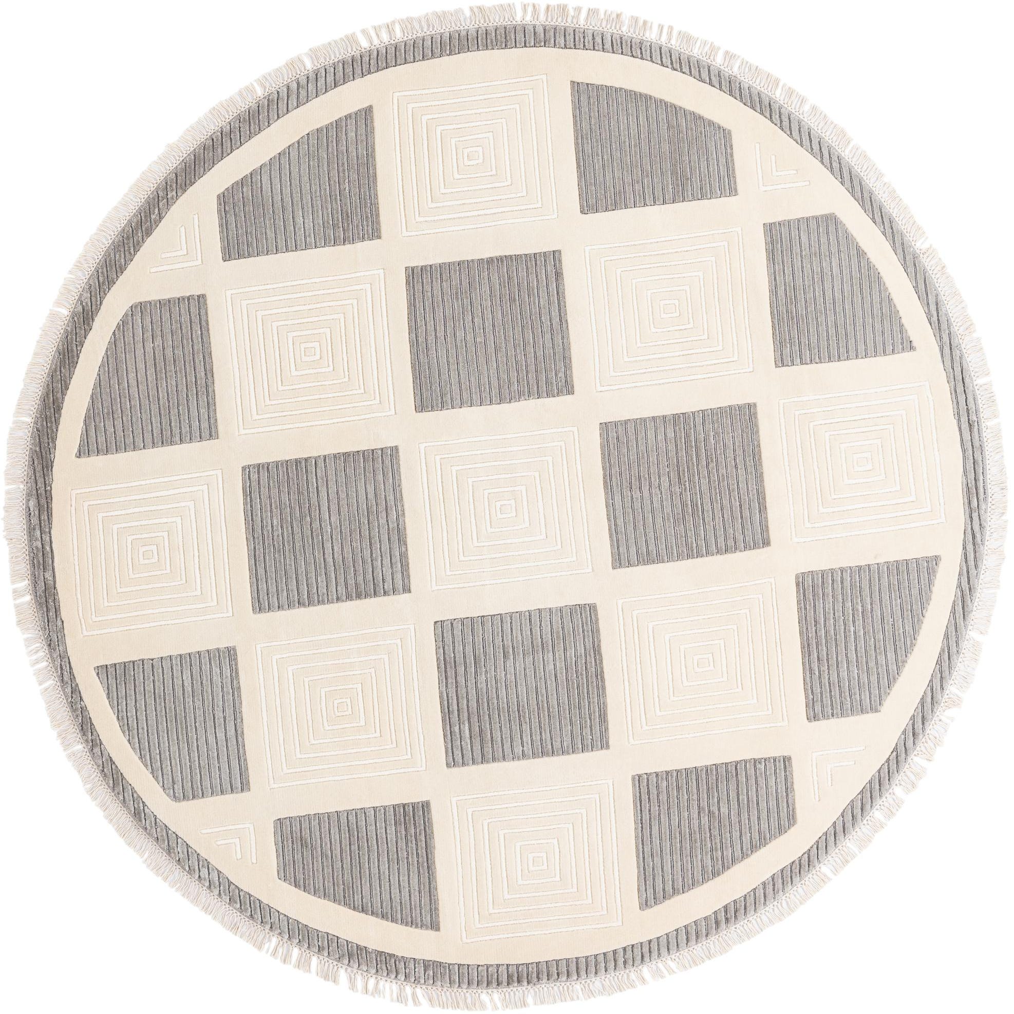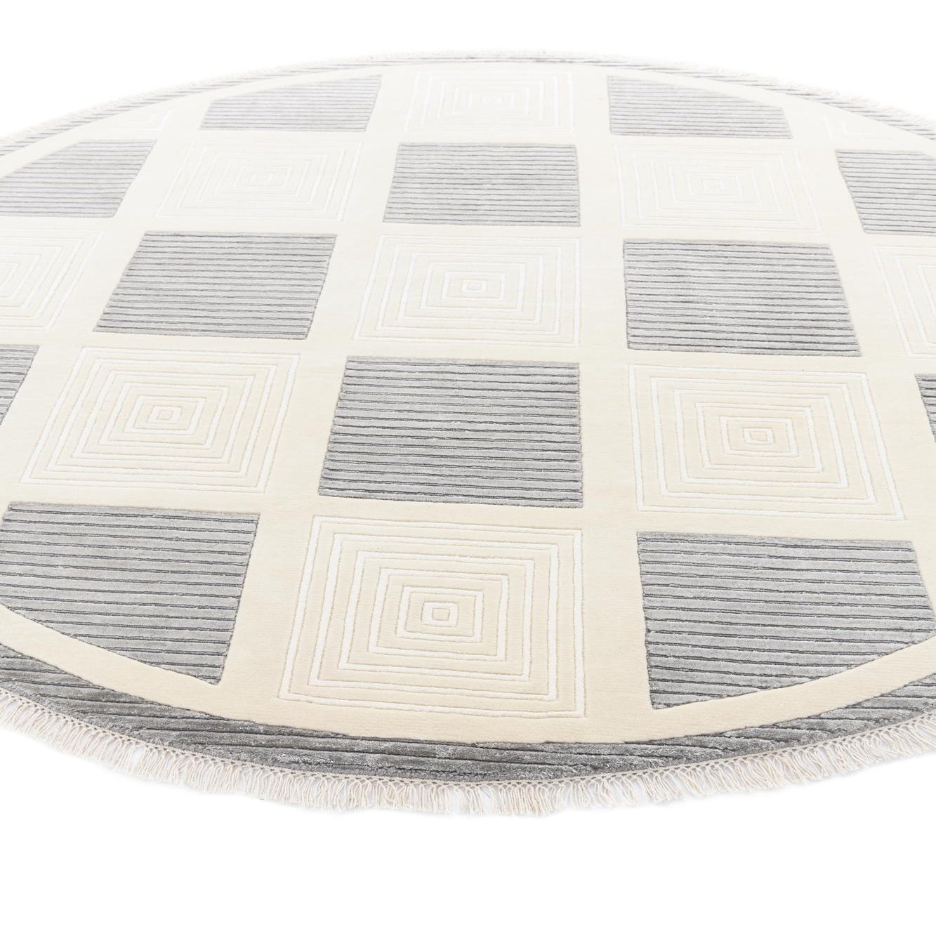 The Darya Collection offers a sophisticated round 6 Ft rug, hand-knotted from 100% wool, which provides both durability and a luxurious feel underfoot. With a dynamic array of colors including beige, gray, ivory, silver, and a multi-toned background, the rug features a contemporary geometric pattern with contrasting squares and concentric squares within each segment, creating an engaging visual texture.