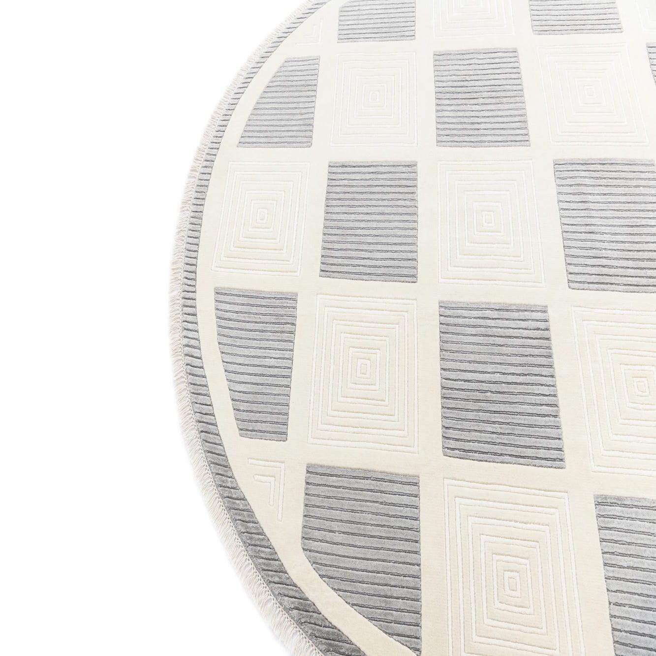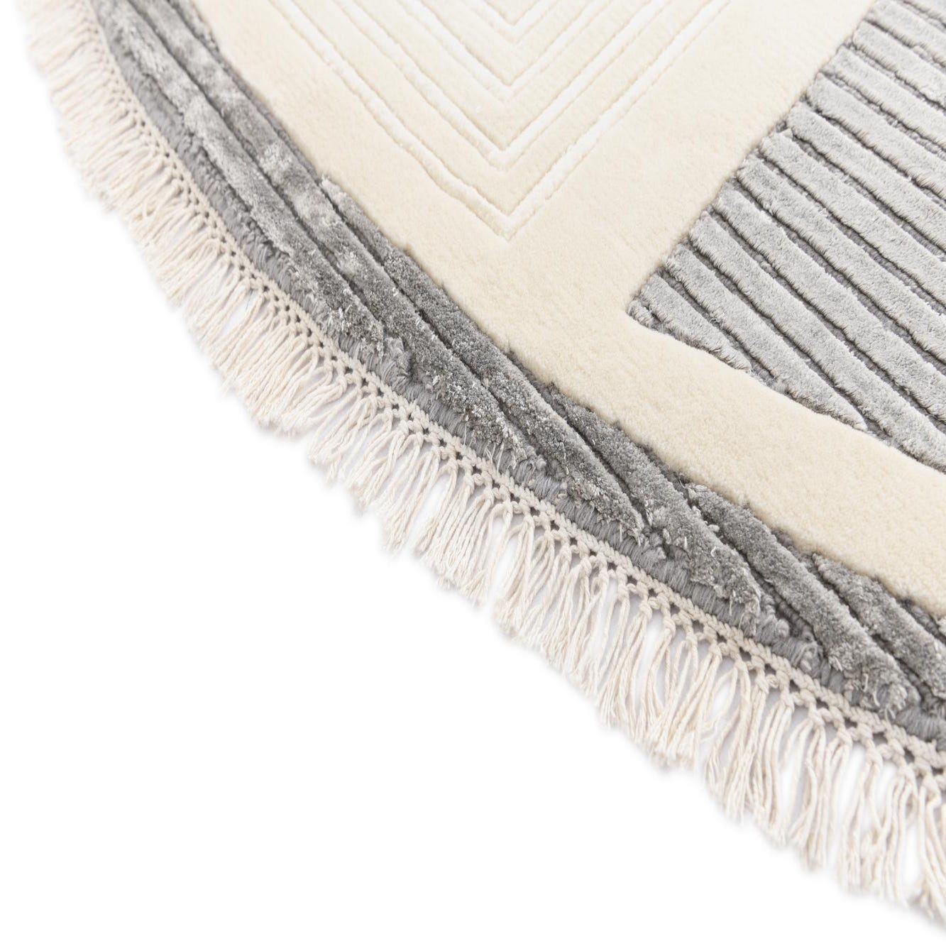 The distinct pattern and neutral color palette make this rug exceptionally versatile for various interior design themes. It would complement a modern minimalist space with its clean lines, as well as a transitional setting that bridges contemporary and traditional elements. The round shape is ideal for anchoring furniture in a seating area or under a circular dining table, adding both comfort and a touch of modern charm to the space.