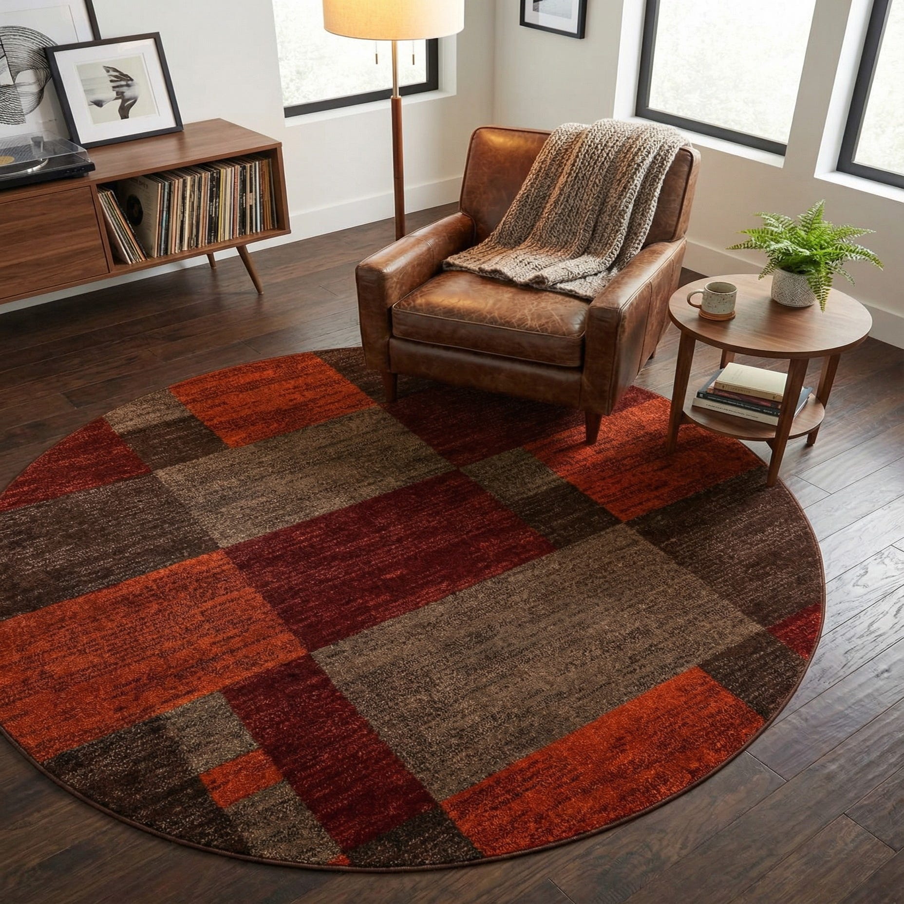 A geometric block pattern arranges rectangles and squares across a circular field, set against a multi background that lets each color stand out. Rich burgundy and bright orange blocks sit alongside warm browns and soft beige, with subtle tonal striations that add visual depth. Made from 100% polypropylene, the rug has a low, dense pile with a slightly lustrous finish that feels soft underfoot while keeping a neat, low-profile look.