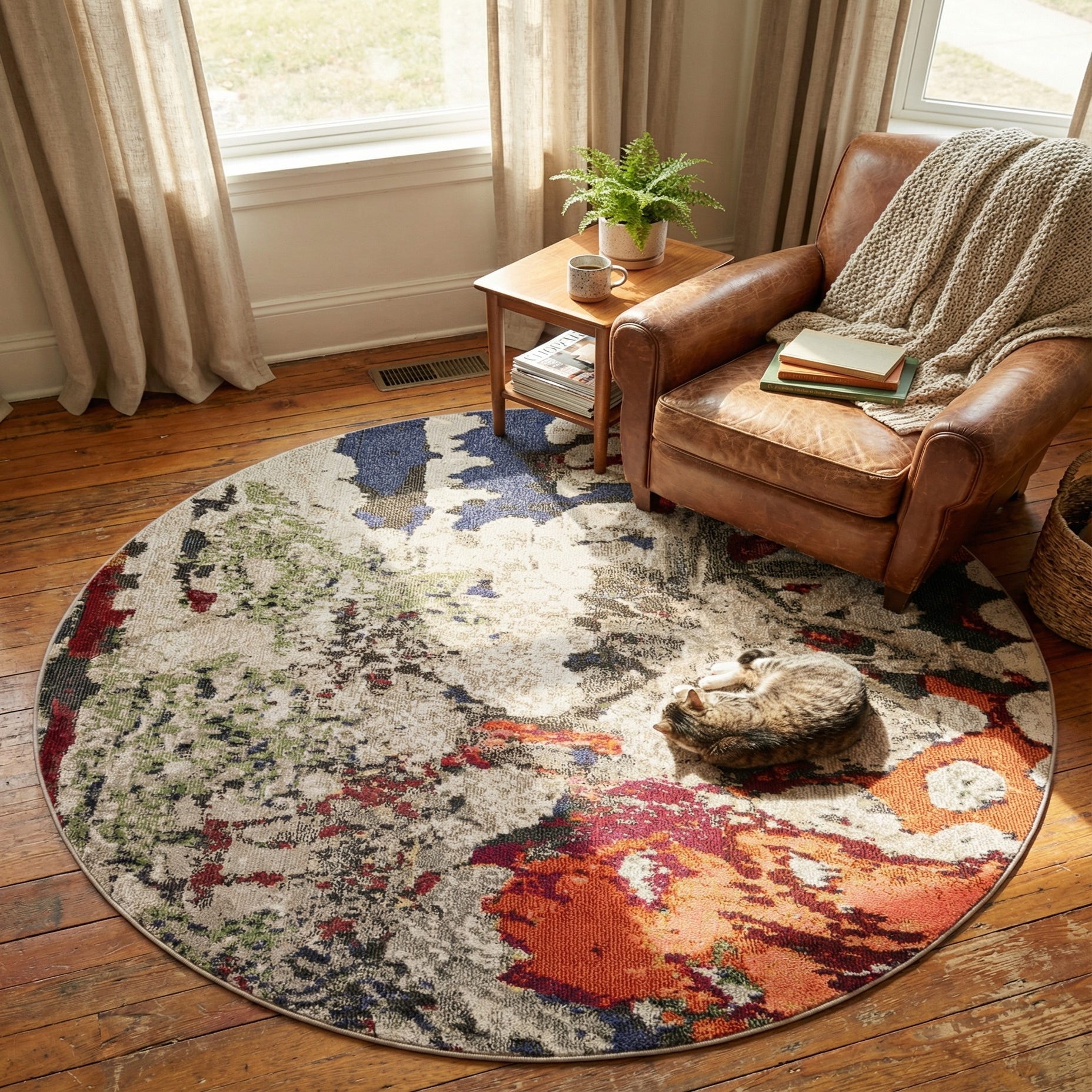 This round rug works well as a focal point in a modern living room or a conversation nook, or layered beneath a circular dining table to add color and motion to the floorplane. Pair it with warm wood furniture and neutral upholstery to let the colors pop, or use it in an eclectic or bohemian scheme alongside patterned textiles and mixed metals for a lively, collected feel. It also complements contemporary and transitional interiors that benefit from an artful, color-forward accent.