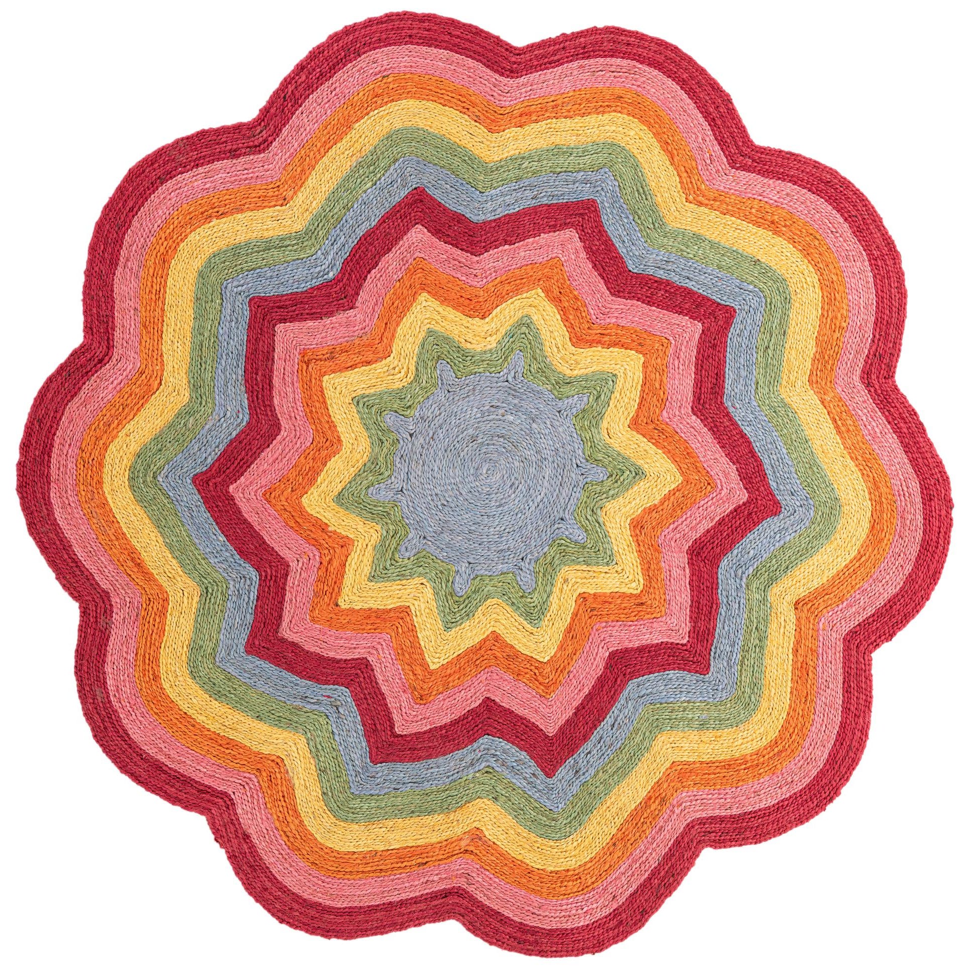 A round, multi-colored jute rug with a wavy, scalloped edge, featuring concentric rings of vibrant colors like red, orange, yellow, green, and blue.