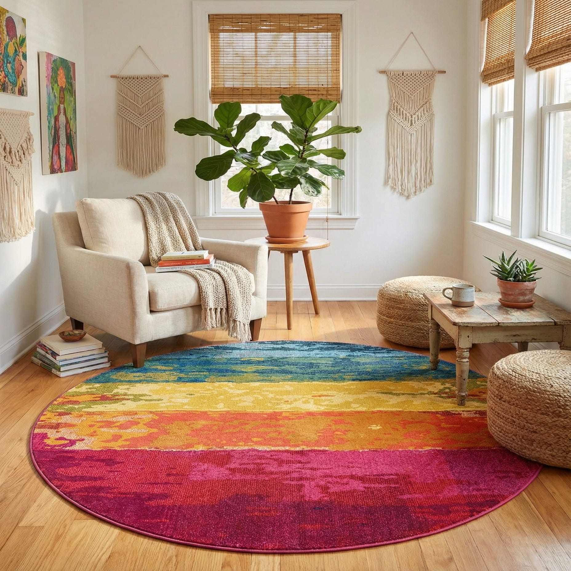 This rug works well as an anchor for a lively living room, bringing energy beneath a neutral sofa or mid-century seating group, and it also makes a strong statement in a creative studio, playroom, or eclectic dining area with a round table. Pair it with natural wood tones and simple upholstery to let the colors take center stage, or layer it into a bohemian scheme with patterned pillows and mixed textiles for a collected, artistic look.
