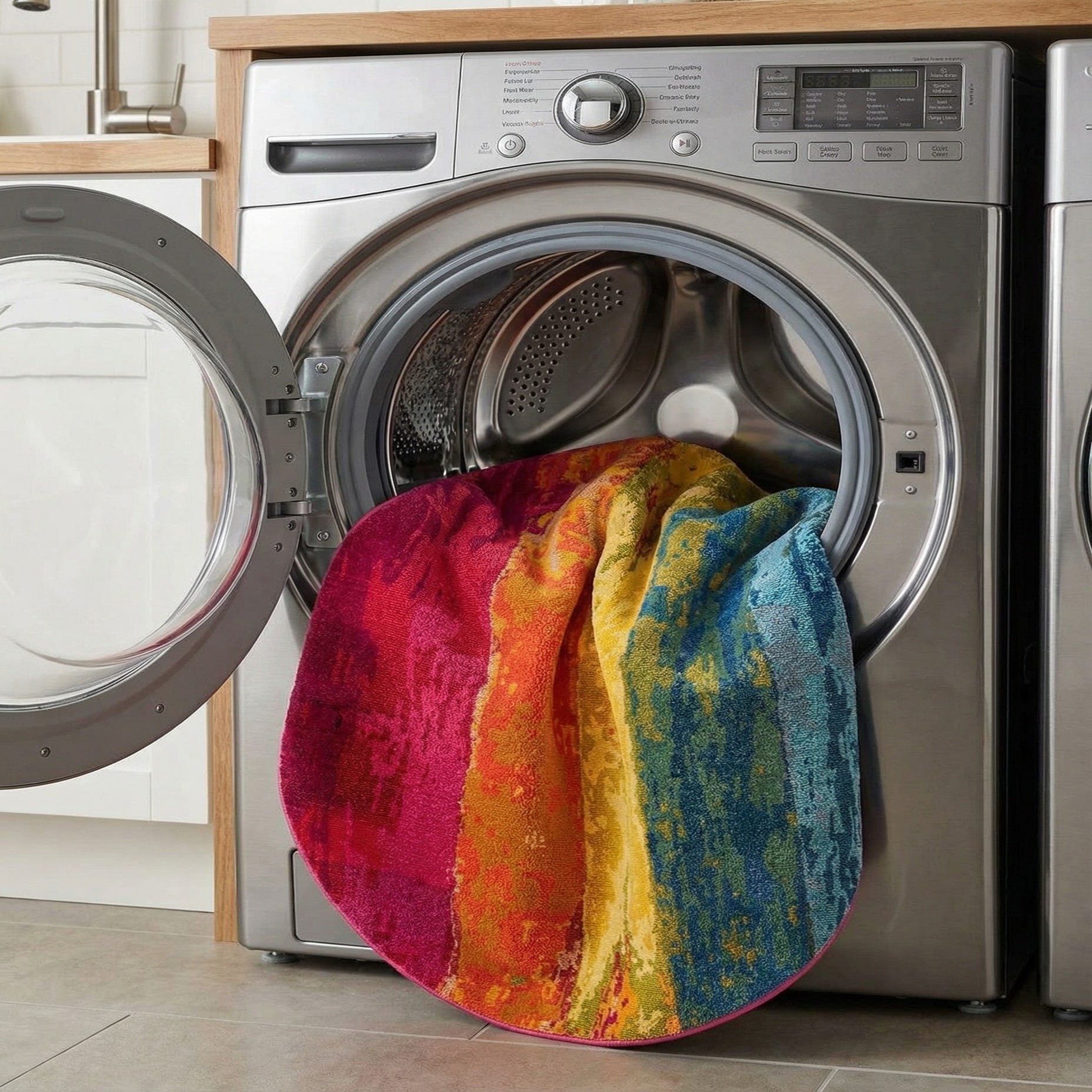 This rug works well as an anchor for a lively living room, bringing energy beneath a neutral sofa or mid-century seating group, and it also makes a strong statement in a creative studio, playroom, or eclectic dining area with a round table. Pair it with natural wood tones and simple upholstery to let the colors take center stage, or layer it into a bohemian scheme with patterned pillows and mixed textiles for a collected, artistic look.