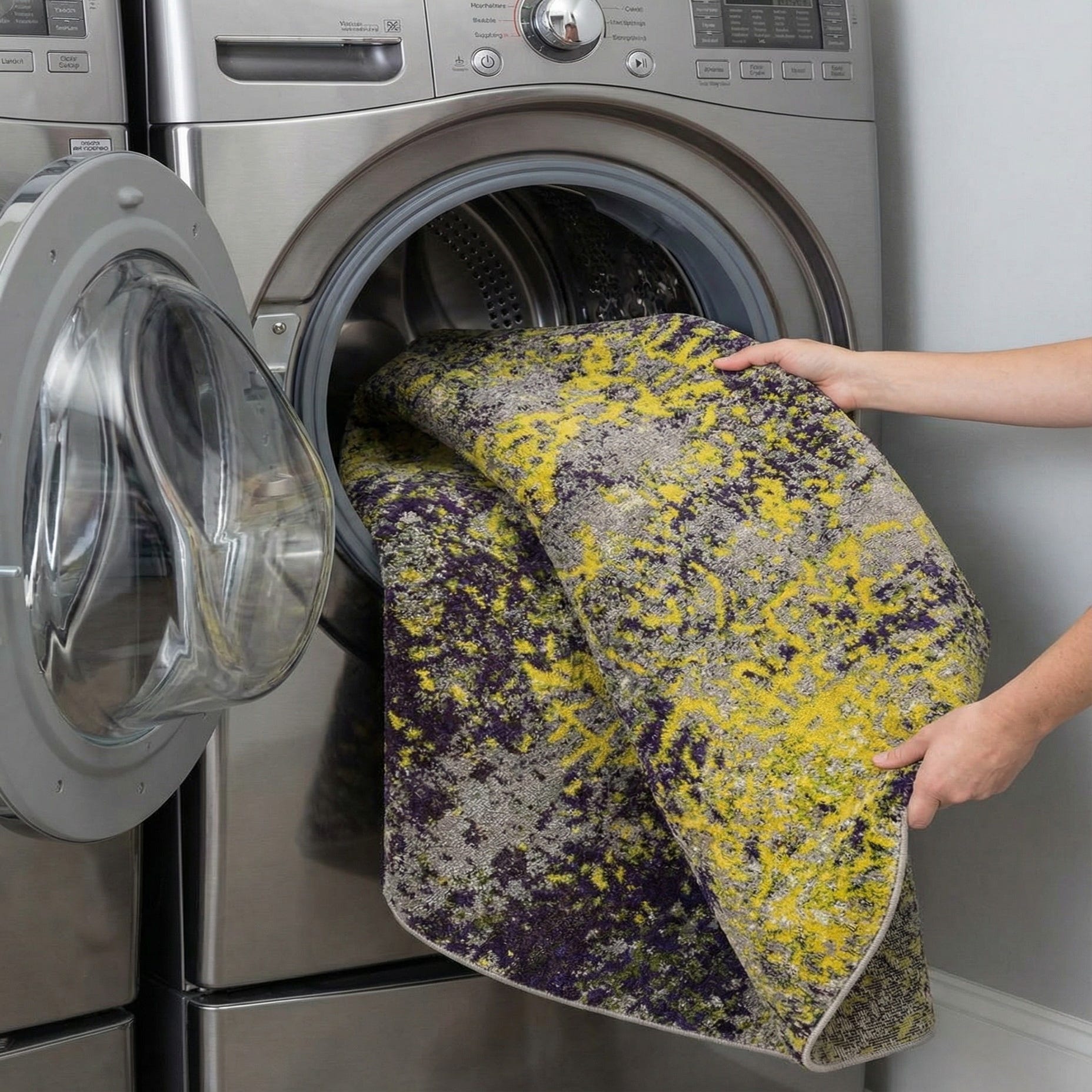 The round shape makes this piece an ideal anchor for a small seating group, a cozy reading nook, or beneath a round dining table. It pairs well with mid-century modern wood tones, contemporary neutral upholstery, or industrial metal accents; the yellow accents introduce a lively focal point while the muted neutrals maintain balance. Because of its construction and look, the rug fits nicely in living rooms, home offices, or entryways where a mix of pattern and color will enhance layered, relaxed interiors.
