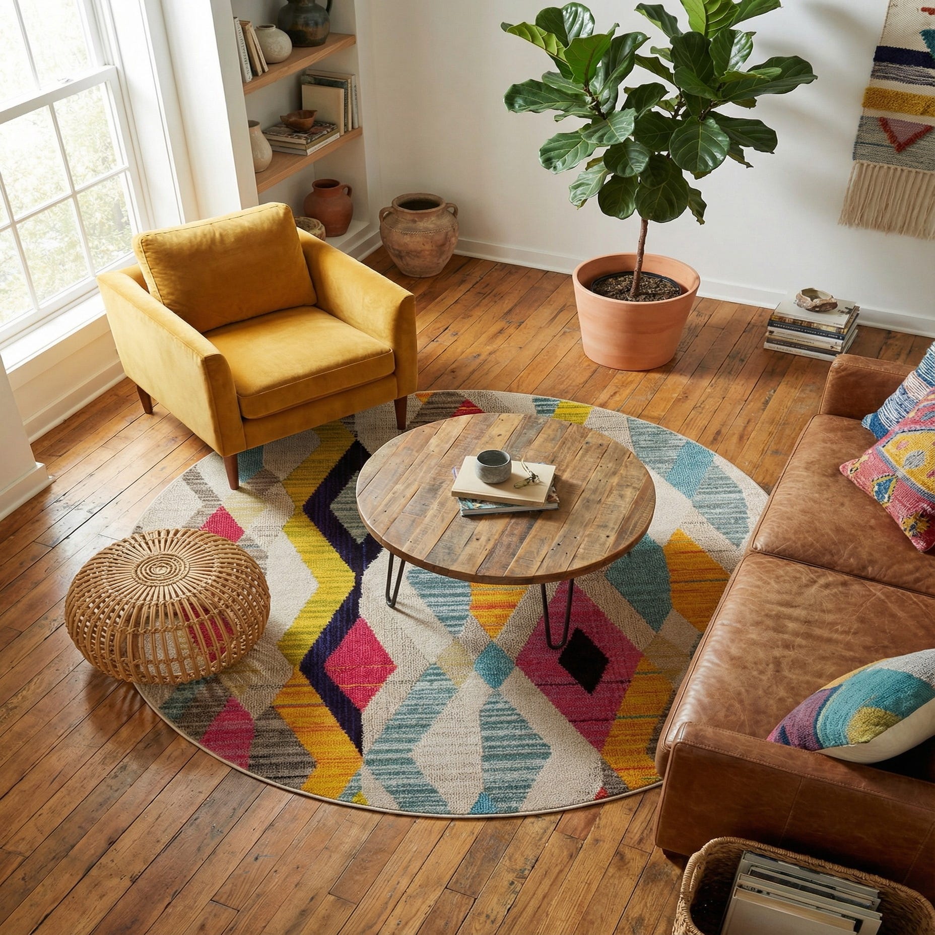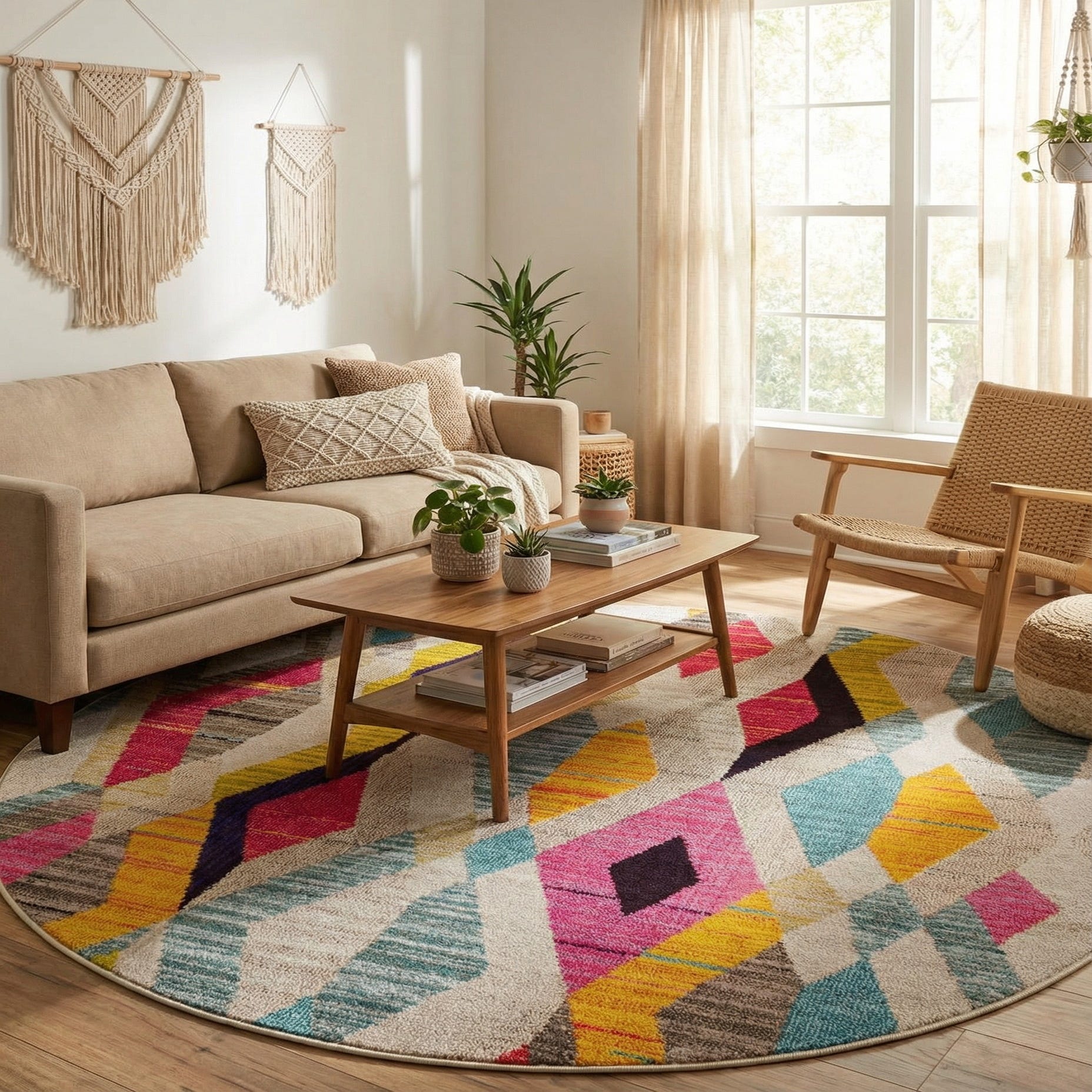 Place this round rug to anchor a casual seating area, tuck it beneath a small dining set or use it to add color and pattern to an entry or playroom. It complements mid-century and contemporary furnishings, pairs well with natural wood tones and neutral upholstery, and can be layered into a bohemian or eclectic scheme for extra warmth and personality.