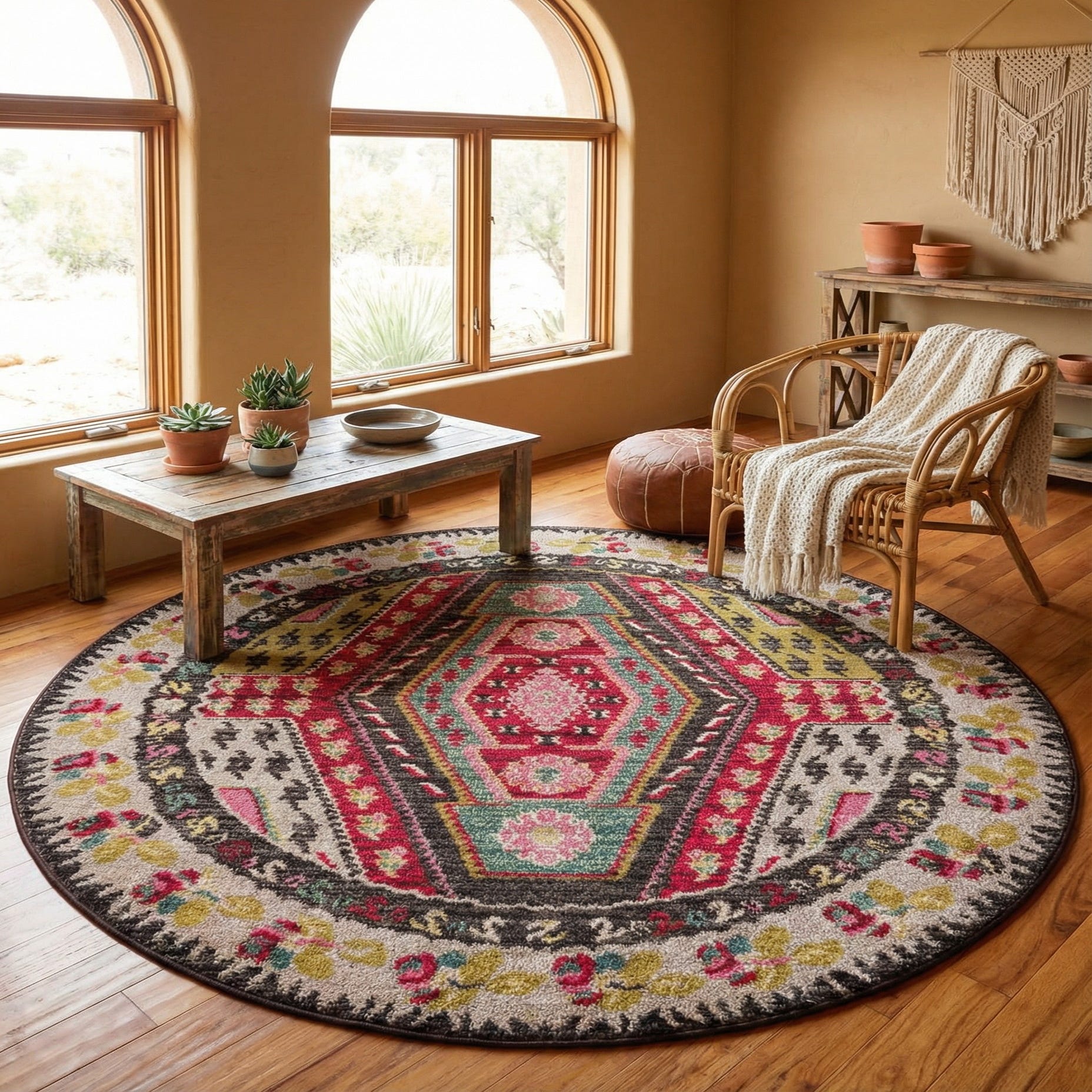 Place it under a round coffee table to anchor a living room seating group, layer it in a bedroom sitting area to add color and pattern, or use it in a casual dining nook or entry to soften hard floors. It pairs well with mid-century and eclectic furnishings, warm wood tones and neutral upholstery when you want a lively focal point, or with global-inspired décor and mixed textiles to complement a collected look.