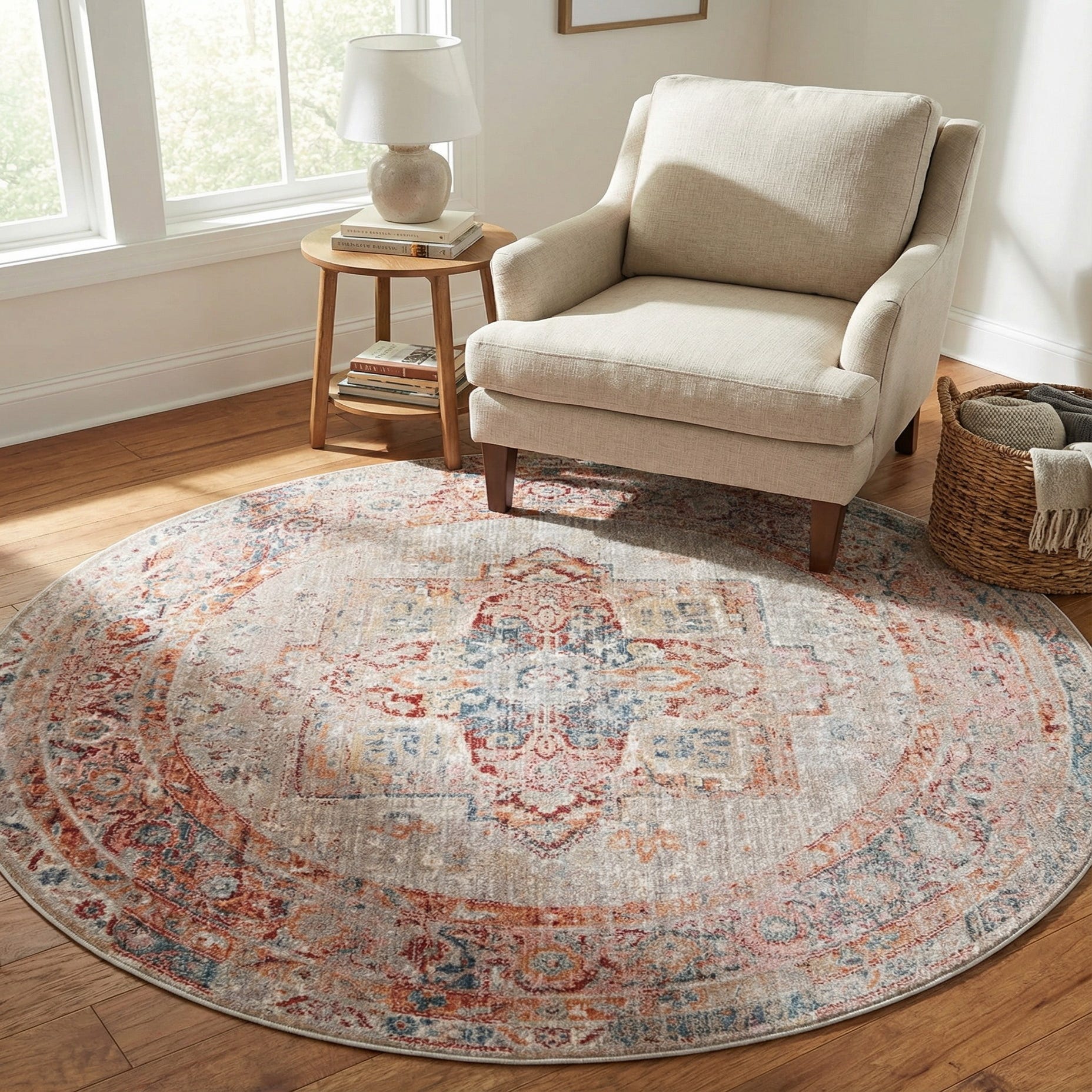 Use this rug beneath a round dining table or to define a cozy seating corner; it also makes a welcoming focal point in a bedroom or entryway. The balanced palette and timeworn pattern suit transitional, farmhouse, and bohemian interiors—pair it with warm wood furniture, ivory upholstery and navy or rust accents to complete the look.