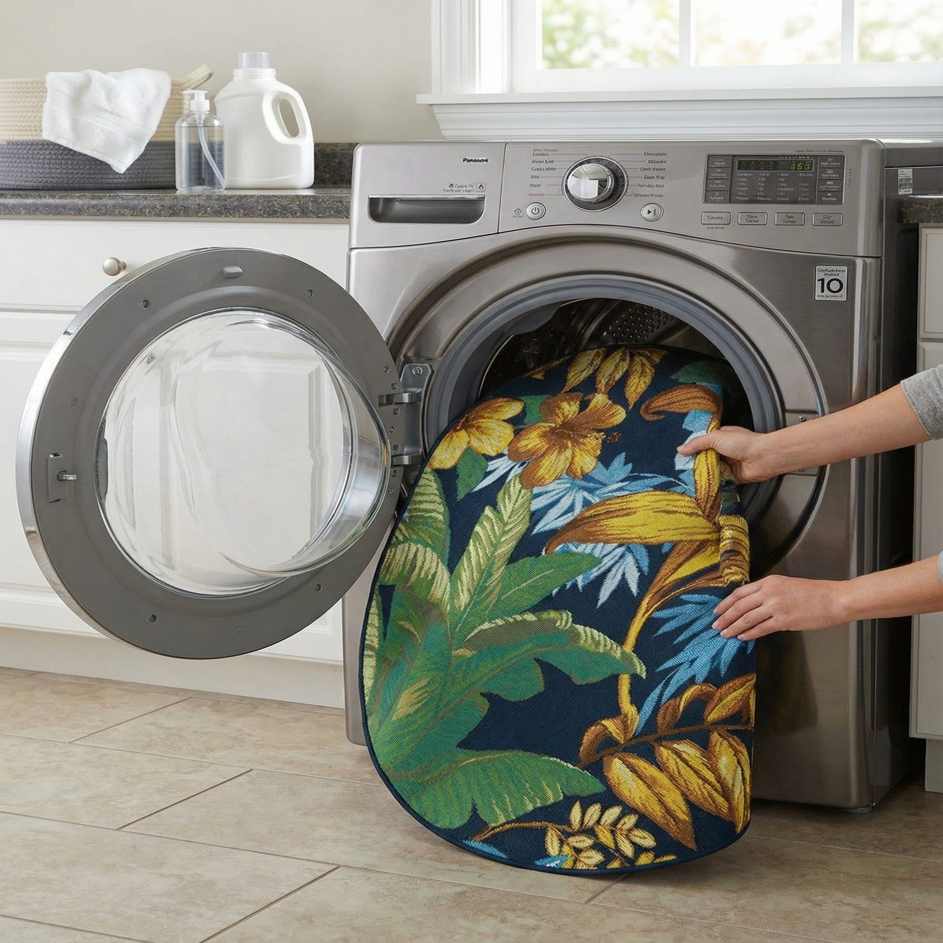 Use this piece to anchor a covered patio or screened porch, add a lively focal point to a sunroom, or bring botanical energy to an entry or casual dining nook. It pairs naturally with rattan or teak furniture, navy and blue textiles, and brass or wicker accents; in interiors, combine it with light wood floors and potted palms for a coastal or modern-boho look, or layer it over a neutral sisal to warm up a seating group.