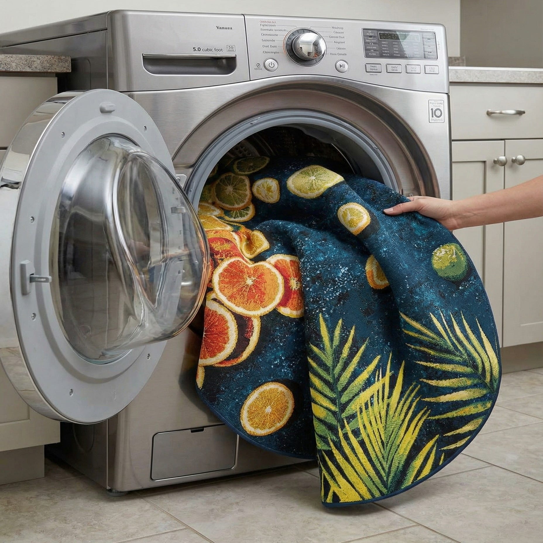 A round, multi-colored rug with a dark blue background, featuring vibrant palm fronds and citrus slices like oranges, lemons, and limes.