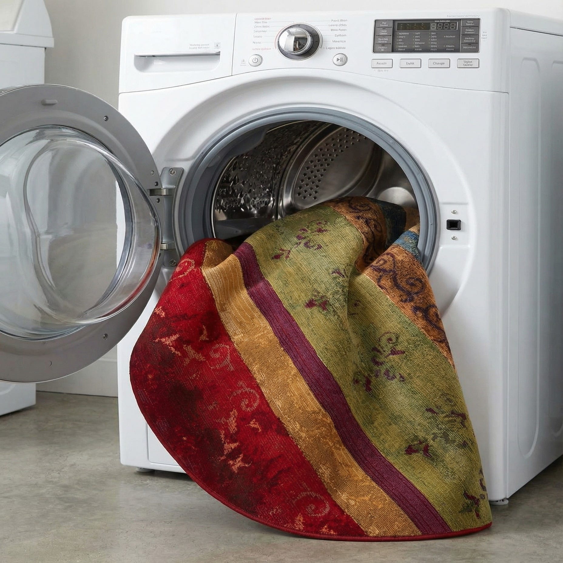 Place this piece on a covered patio or in a sunroom to bring color to outdoor-adjacent spaces, or use it inside a kitchen, dining nook or entry to define an informal seating area. It pairs nicely with natural wood or rattan furniture and navy or cream textiles to highlight the cooler tones, or with iron bistro sets, terracotta planters and warm-toned upholstery to play up the golds and reds. The round shape is particularly effective under circular tables or layered in cozy conversation zones.