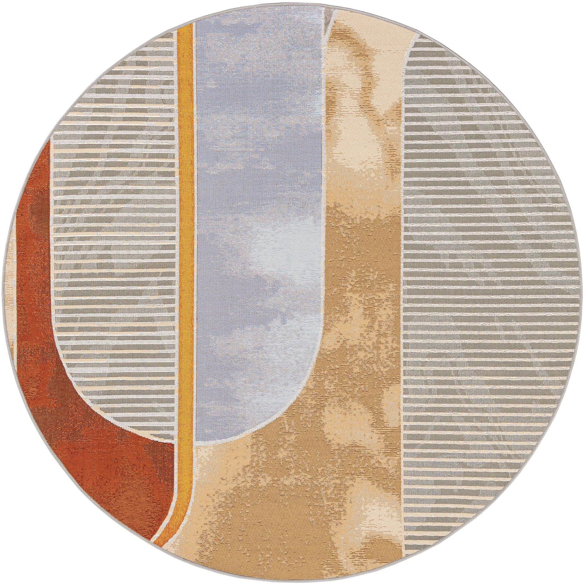 A 6' 1 x 6' 1 round multi-colored contemporary rug with abstract shapes and stripes, suitable for a patio.