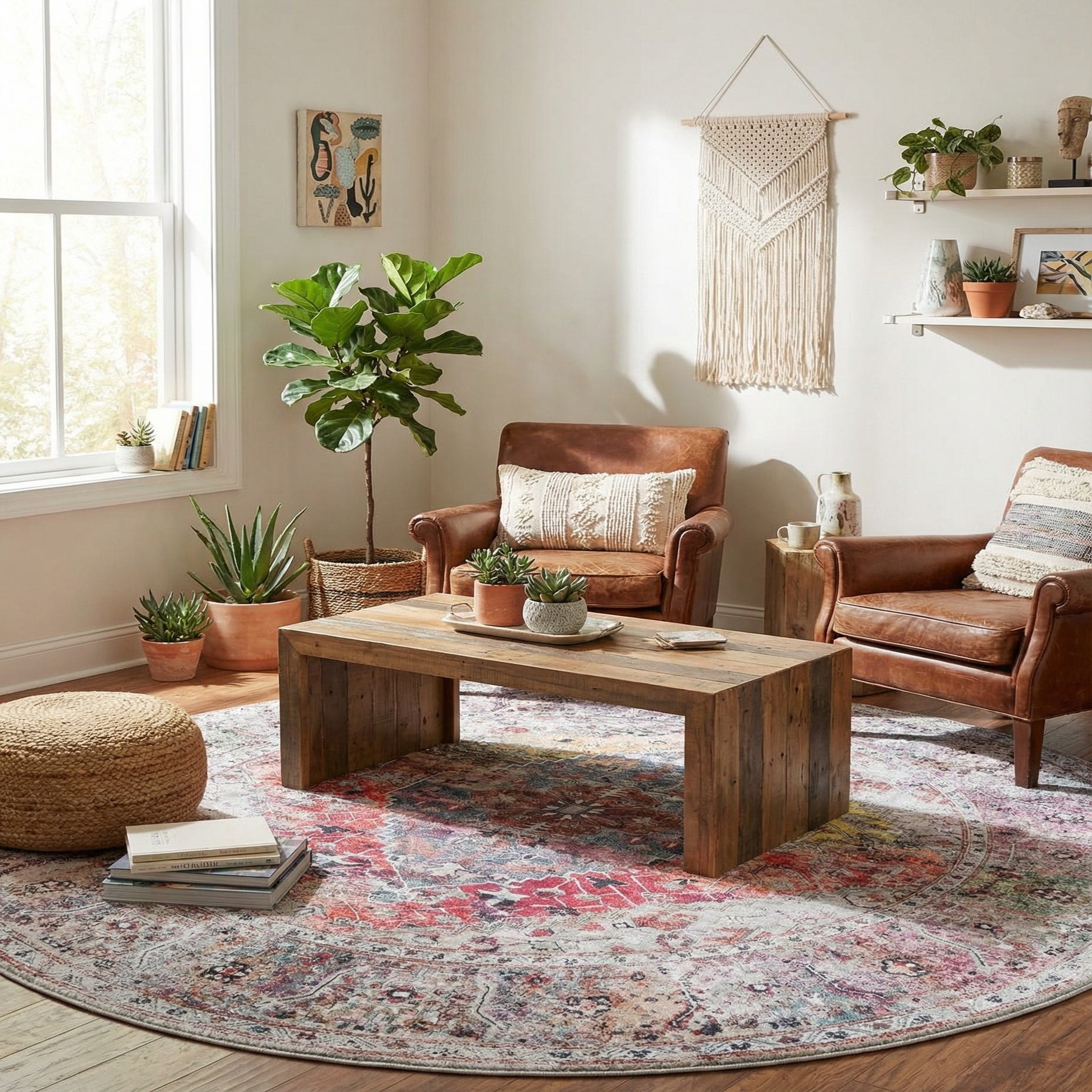 Machine made from polyester and chenille, the surface has a velvety, chenille hand with a low-profile pile that feels smooth underfoot and shows a subtle sheen from the polyester yarns. Its shape and color mix make it a versatile anchor—place it beneath a round dining table, center it in a seating nook, or use it to soften a bedroom seating area. Pair it with light wood furniture and brass or matte black accents for a modern eclectic feel, or layer it with neutral linens and navy upholstery for a cozy, collected look.