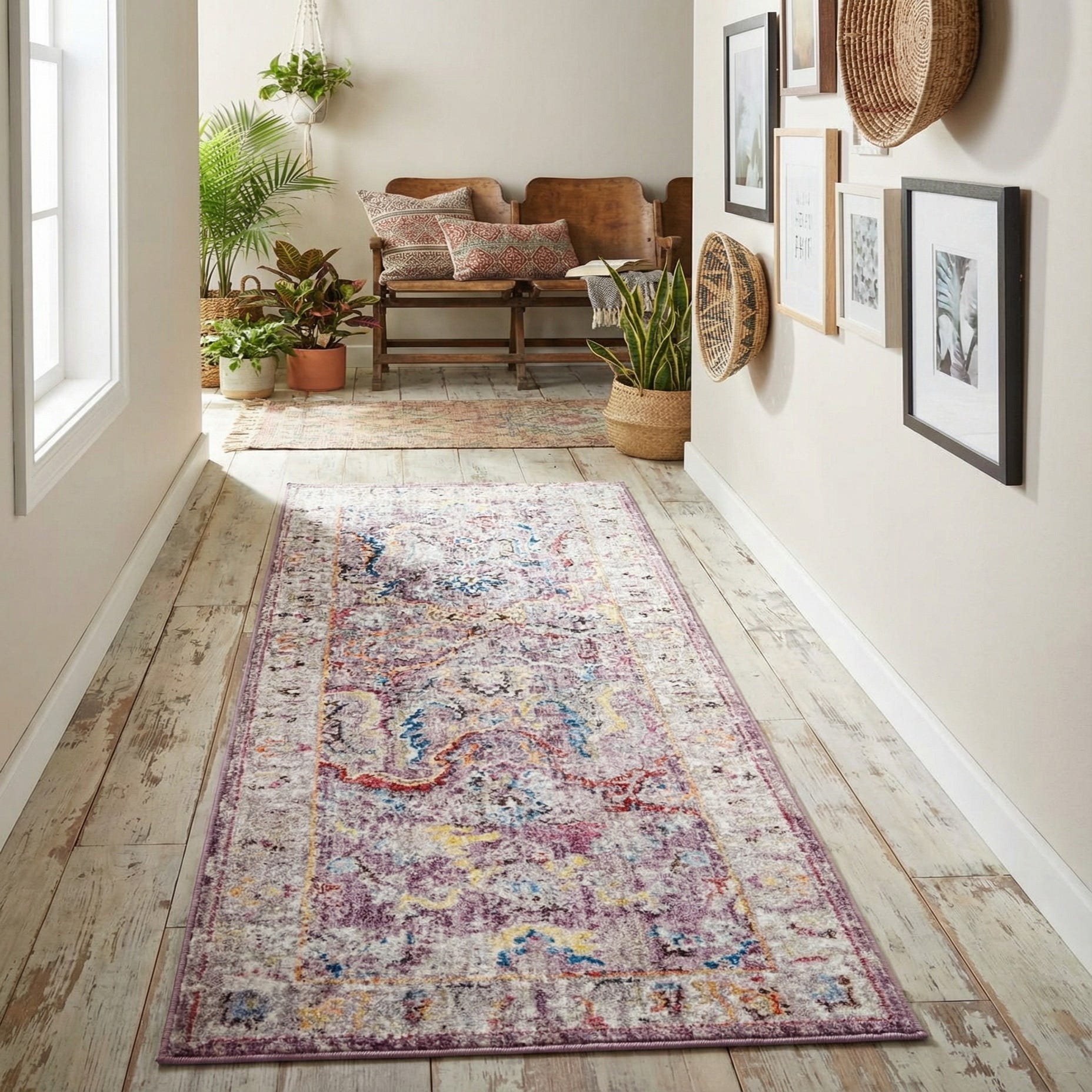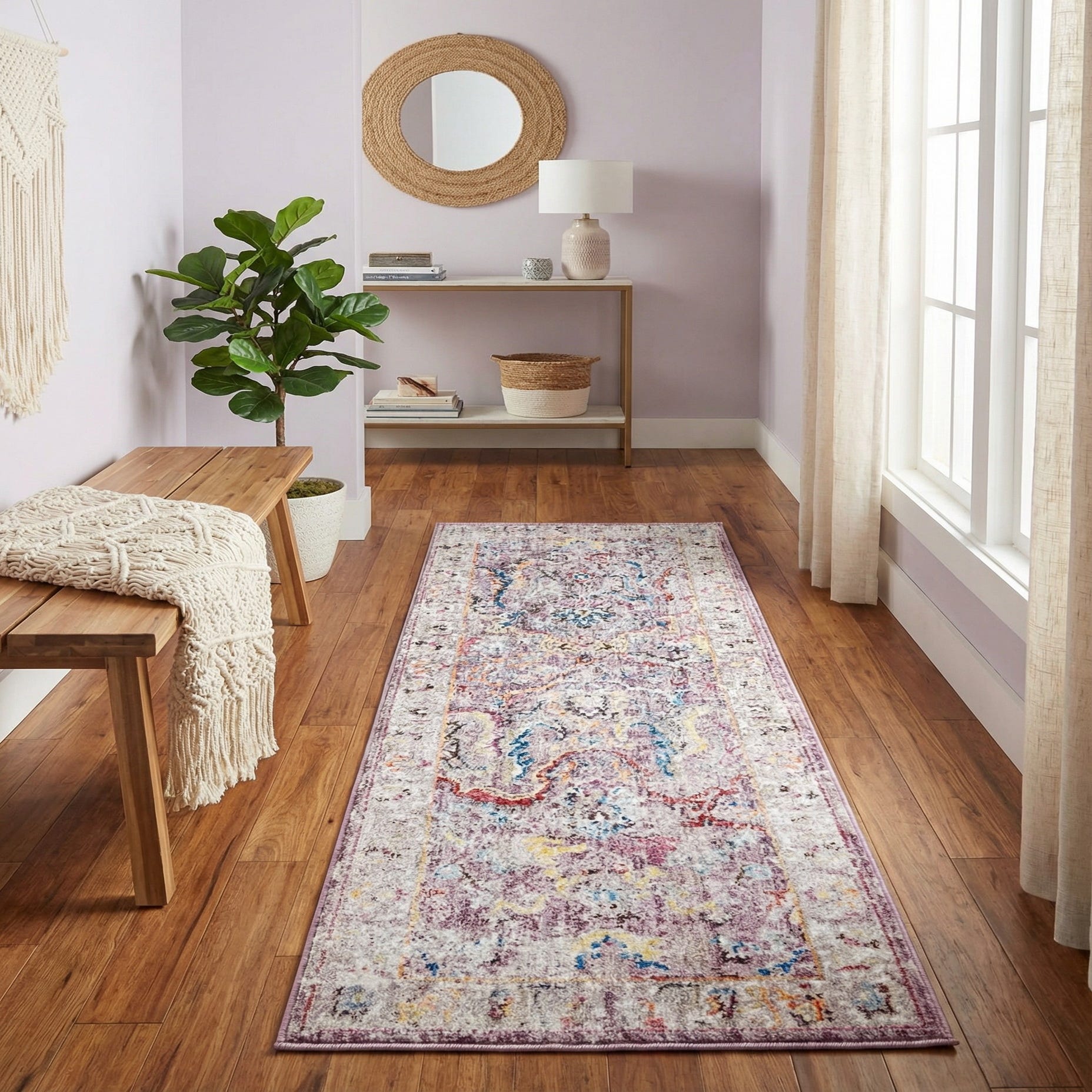 The artistic blend of colors swirls into traditional motifs that bridge the gap between classic and contemporary style, making this runner an excellent choice for those looking to inject a splash of color and sophistication into their home. Its linear form is ideally suited to hallways, entryways, or alongside a kitchen island, providing a long, elegant visual anchor to these spaces. Additionally, the vibrant yet balanced color scheme enables it to stand out in minimalist designs or harmoniously blend with eclectic decor.