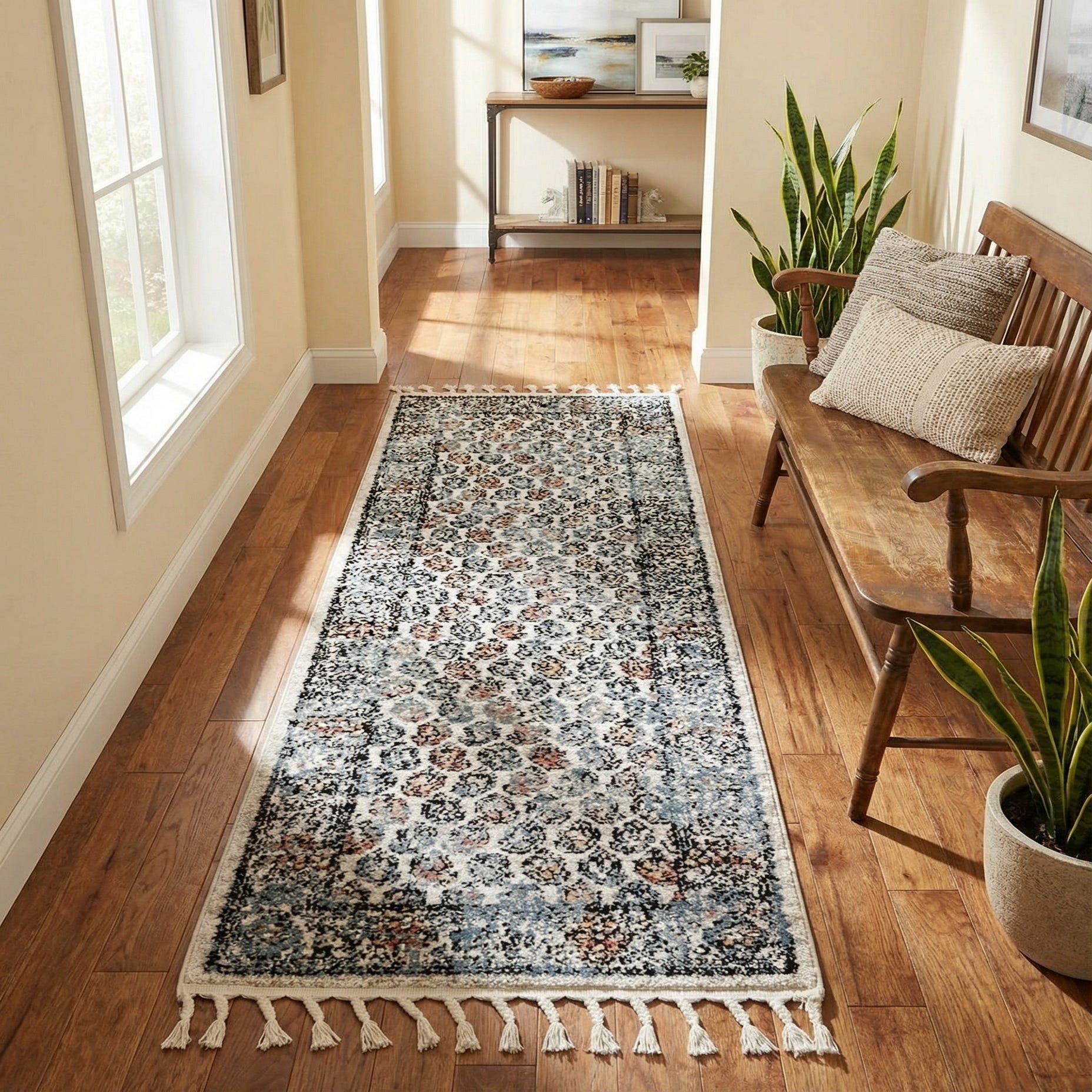 Machine-made from polypropylene, the rug has a low, slightly dense pile with a soft hand that holds the pattern definition well. Use it to anchor a hallway or entry where the runner’s scale and color play will brighten traffic areas, or place it alongside a bed or in a galley kitchen to add visual interest without overpowering the space. It pairs well with neutral sofas and warm wood floors, navy or gray upholstery, and eclectic or transitional interiors that mix modern furnishings with vintage accents.