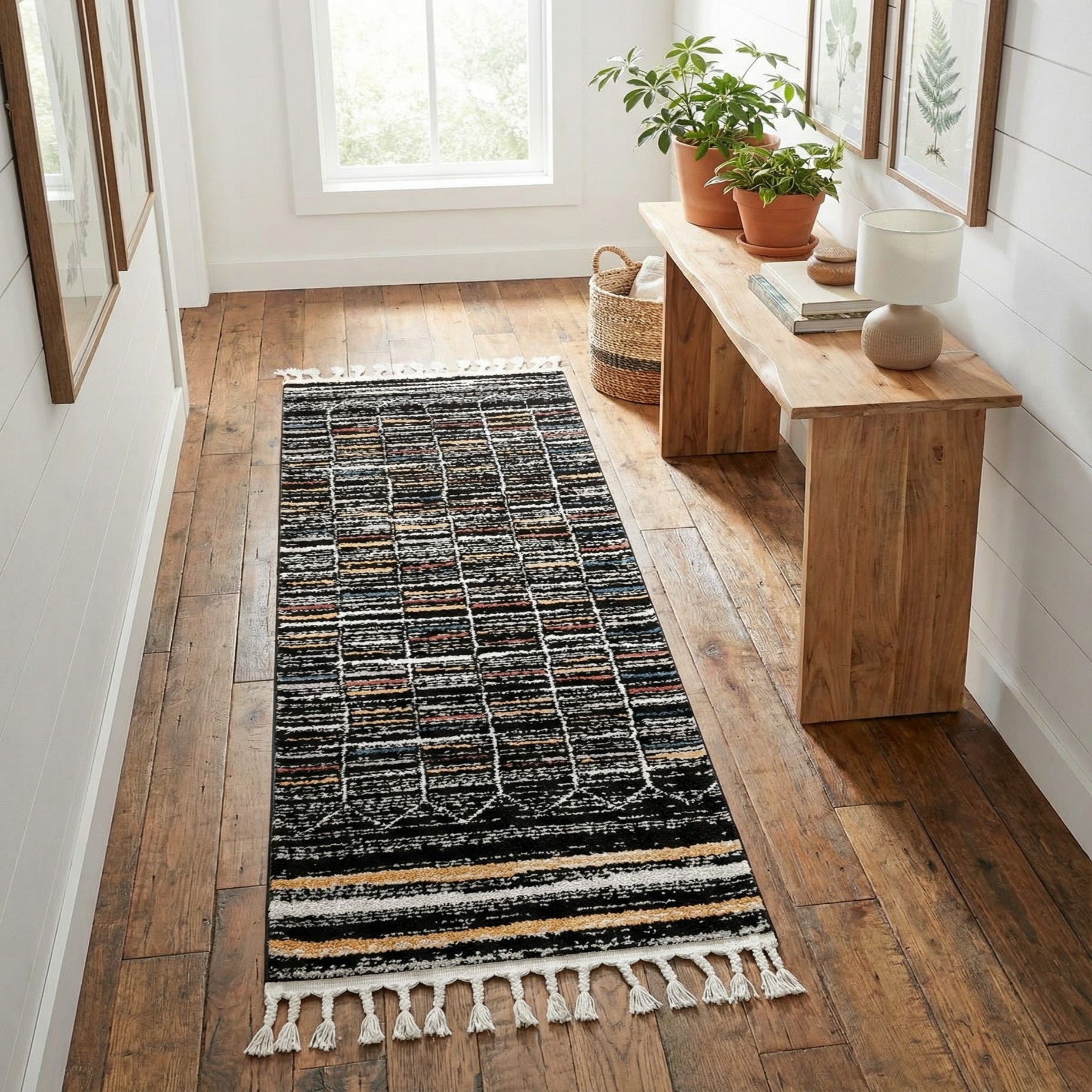 Place this runner down a high-traffic hallway or entry to add color and rhythm to a narrow space, or use it along a kitchen aisle or beside a bed to introduce pattern without overwhelming the room. It pairs well with warm wood or black metal furnishings and layered textiles—think neutral sofas with blue or peach accent pillows, mid-century seating, or an eclectic mix of textures in a transitional living area.