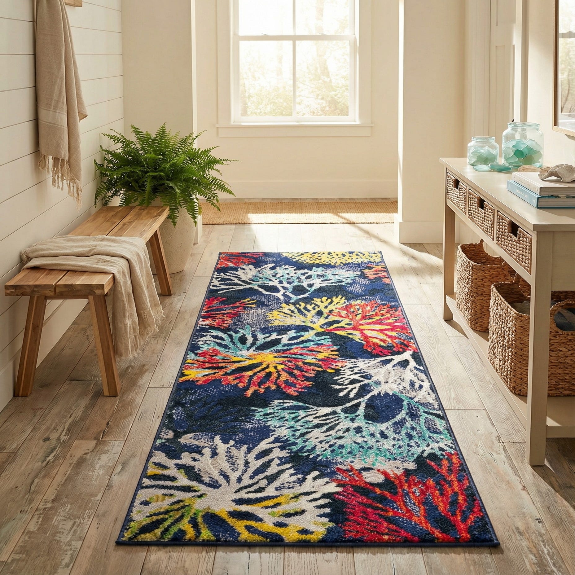 Machine-made from 70% polypropylene and 30% polyester, the pile has a soft, slightly dense hand with enough texture to give the motifs subtle dimensionality underfoot. Use this runner to enliven a hallway or entry, define a kitchen galley or laundry room, or add color at the foot of a bed. It pairs well with whitewashed or light oak floors for a beach-inspired look, navy or charcoal upholstery for a coordinated modern scheme, or layered with woven accessories and linen textiles for a relaxed, eclectic interior.