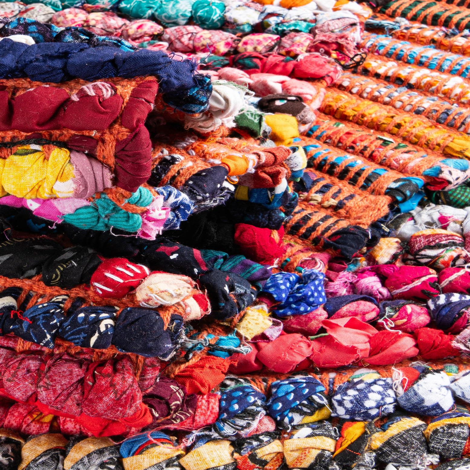 A vibrant 6 ft multi-colored runner rug made from braided cotton chindi strips, showcasing an eclectic striped pattern.