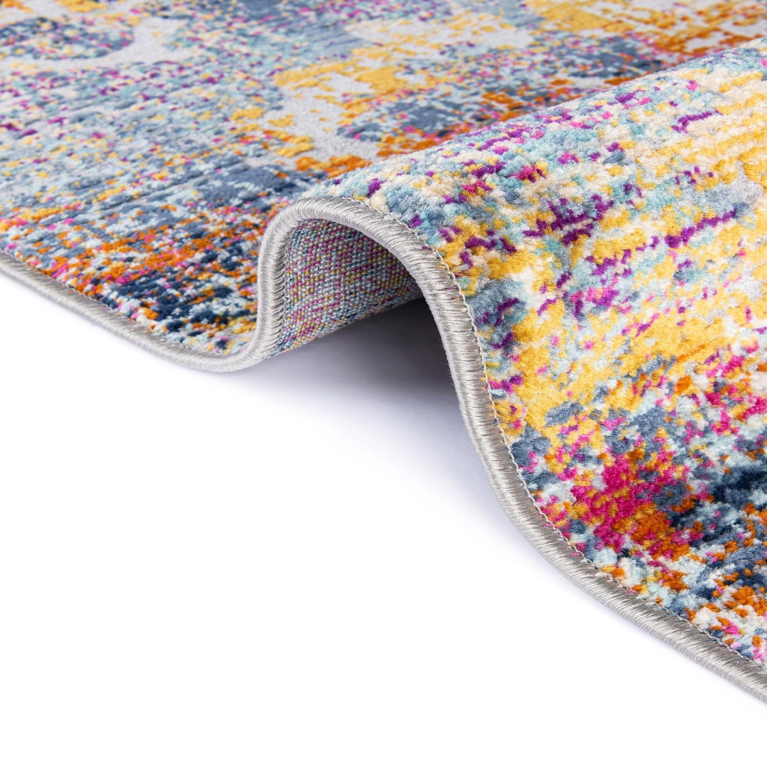 A 6 ft multi-colored runner rug with an abstract, bohemian pattern in shades of orange, blue, purple, and pink, ideal for a hallway.