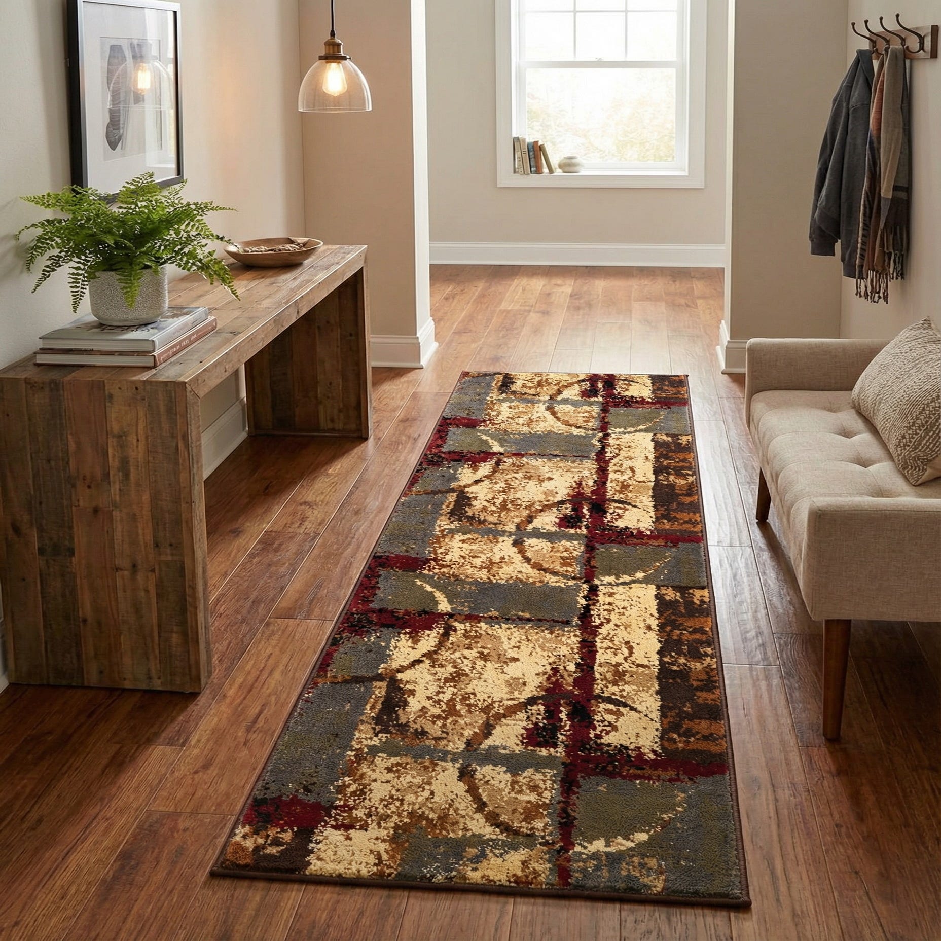 Machine made from 100% polypropylene, the rug has a dense cut pile that feels softly cushioned underfoot with a subtle sheen across the surface. Place it as a hallway or entry runner to anchor foot traffic, run it along a kitchen aisle to add color and pattern, or lay it along the side of a bed to warm hardwood floors. It pairs well with warm wood tones, leather or charcoal upholstery, and layered textiles—use burgundy or olive accents in pillows or art to pull the palette together for a cohesive, lived-in look.