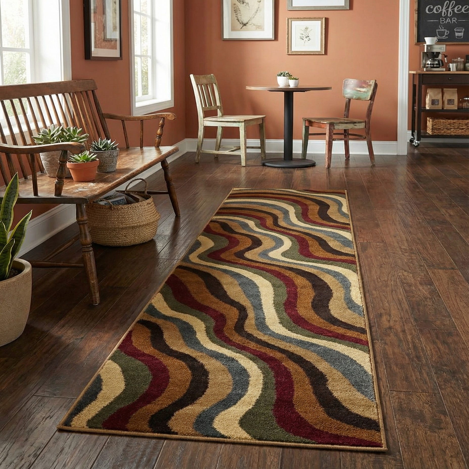 Machine-made from 100% polypropylene, this runner has a dense, cut pile with a plush hand that feels cushioned underfoot. A series of undulating, wave-like bands flow the length of the rug, alternating warm neutrals and deeper accents. The multi background supports stripes of beige, light brown, brown, gray, olive, maroon and red, producing layered depth and lively motion without overwhelming a space.