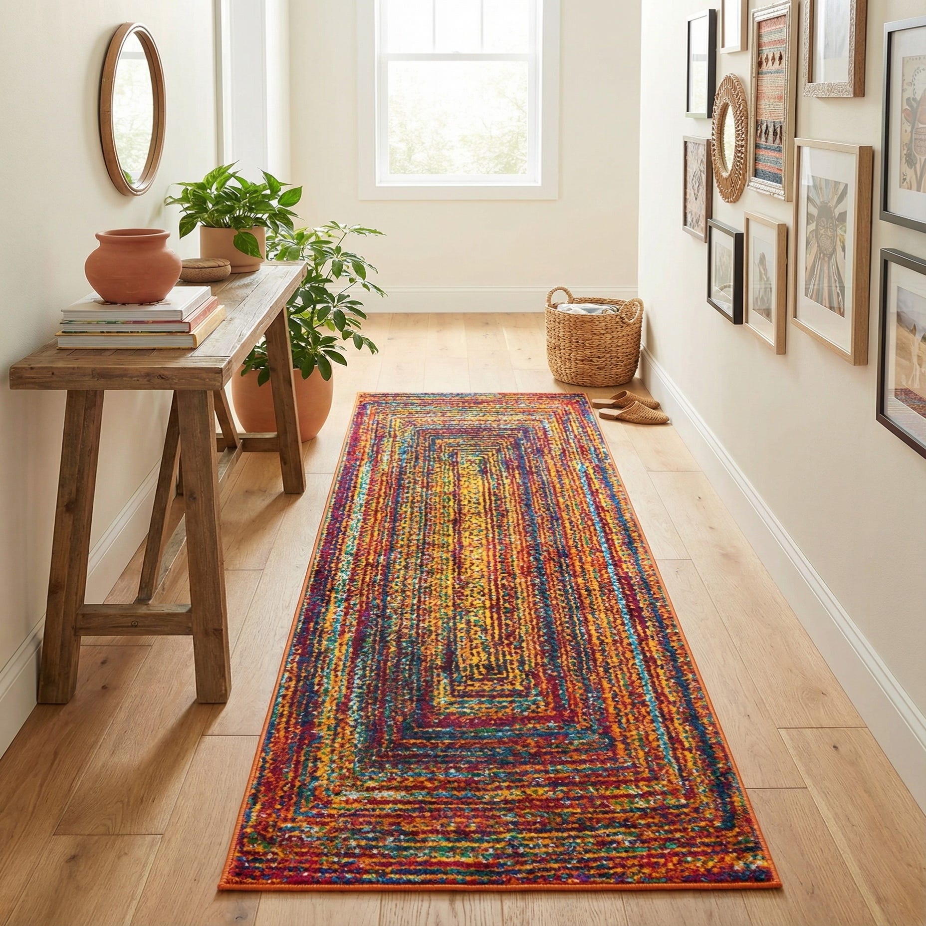 This vibrant runner works well in a busy hallway or entry to add movement and color without overwhelming the space. It pairs naturally with warm wood floors and neutral furnishings, or use it to introduce bold contrast alongside navy or teal accents in a modern living area. It also suits eclectic or bohemian interiors and makes a cheerful, practical choice for a kitchen or narrow seating nook.