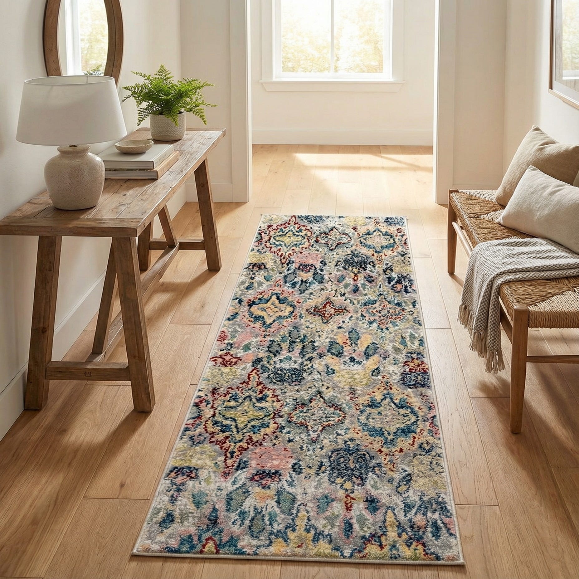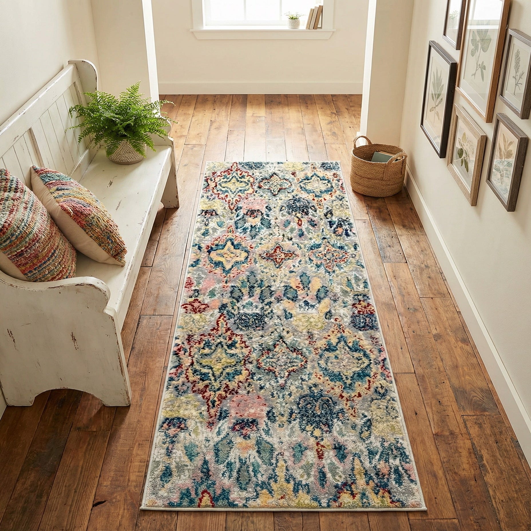 The mix of warm and cool tones and relaxed, vintage character works well in transitional or eclectic interiors. Place it in a hallway or entry to set a welcoming tone, run it along a narrow kitchen or galley to add color and pattern, or layer it in a bedroom to soften modern furnishings and pull accent hues together. Its versatile palette pairs easily with natural wood, muted neutrals, or bolder upholstered pieces, making it a practical choice for lively, lived-in rooms.