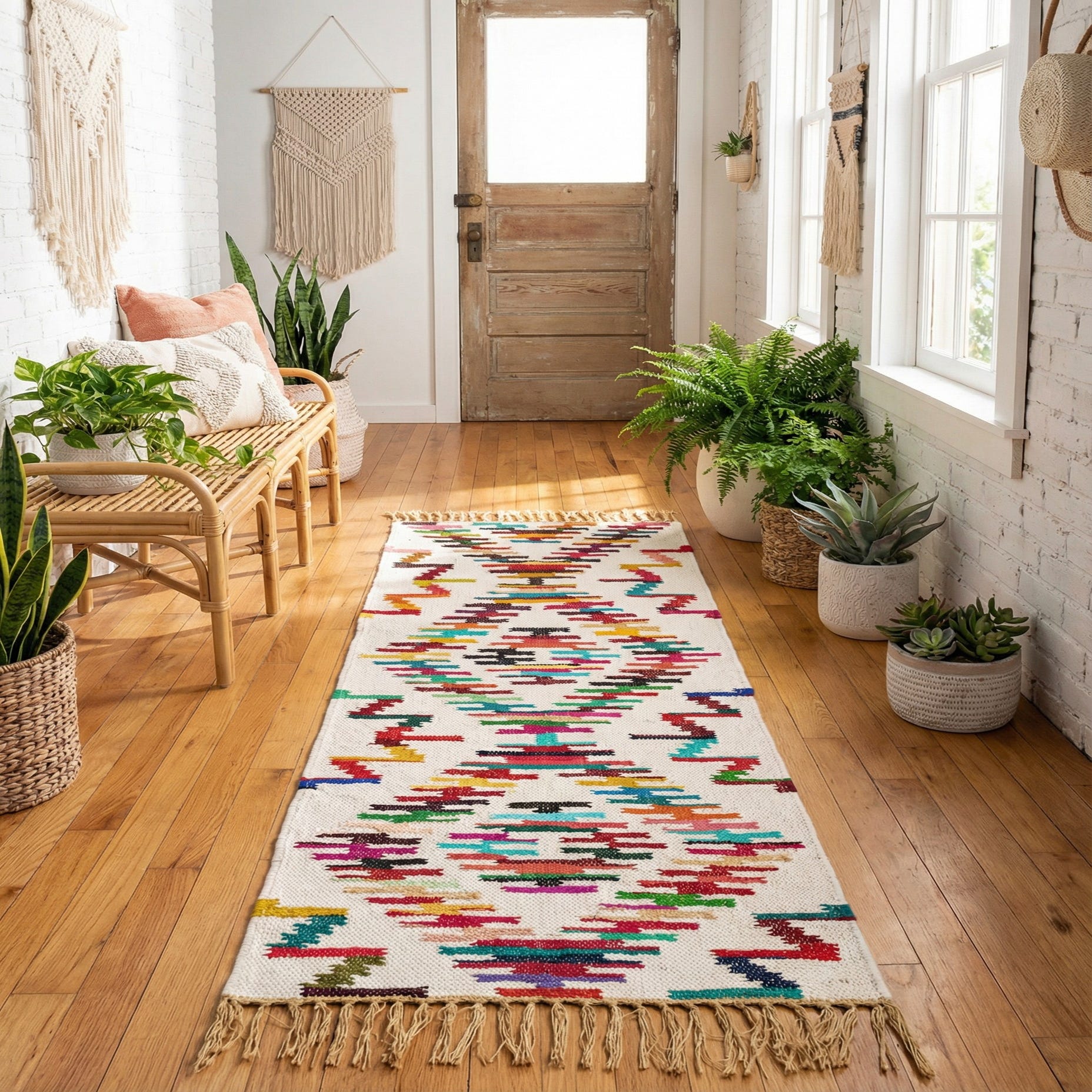 This piece works well in relaxed, layered interiors: use it to enliven a hallway or entry, add pattern and softness to a kitchen aisle, or place it along the side of a bed for a pop of color underfoot. It complements bohemian and global-inspired rooms, pairs nicely with natural woods and woven accents, and can also bring a playful contrast to more minimal or mid-century modern furnishings by tying together scattered accent colors.
