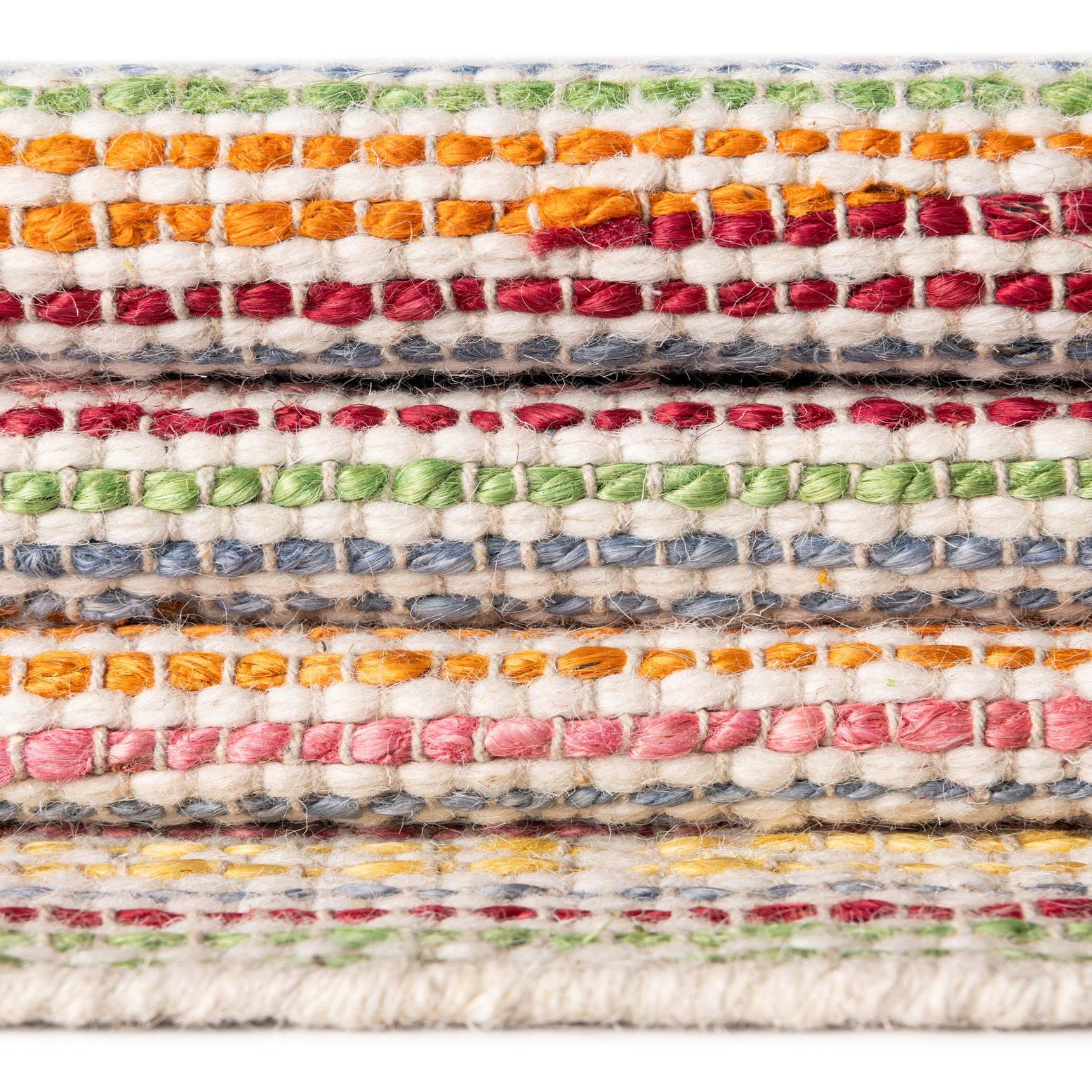 A 6 ft multi-colored runner rug with horizontal stripes in various pastel and bright hues, made from jute, wool, and cotton.