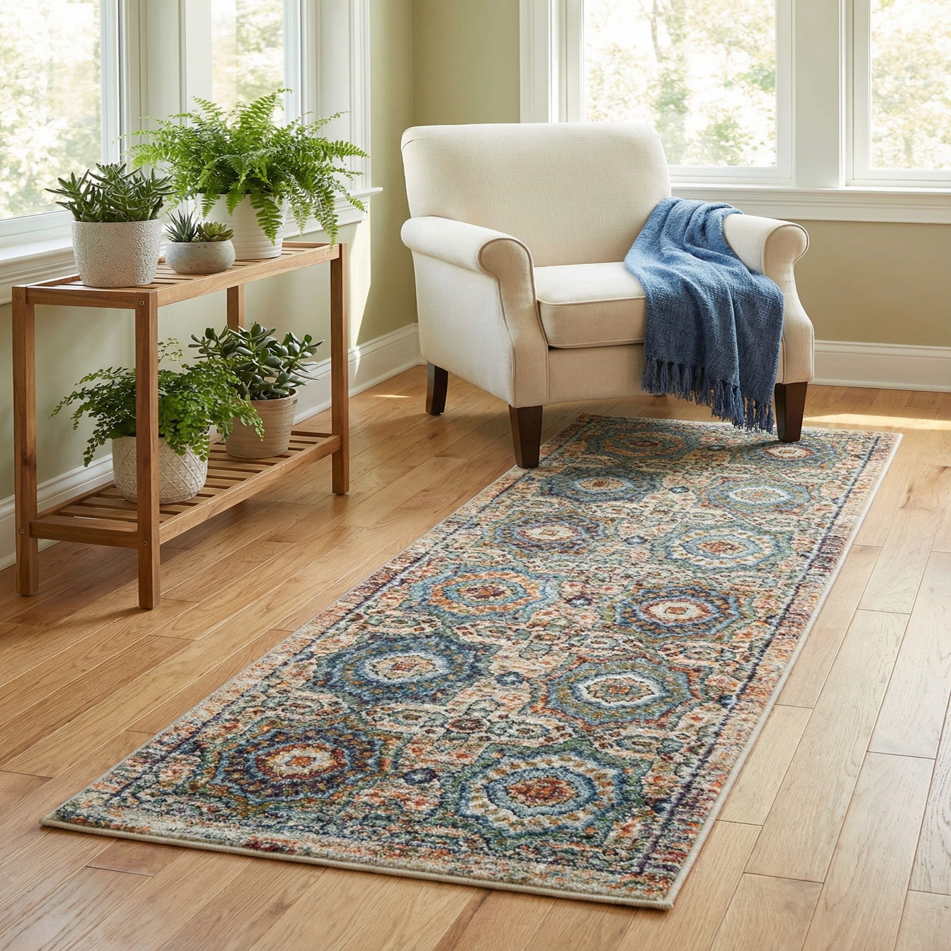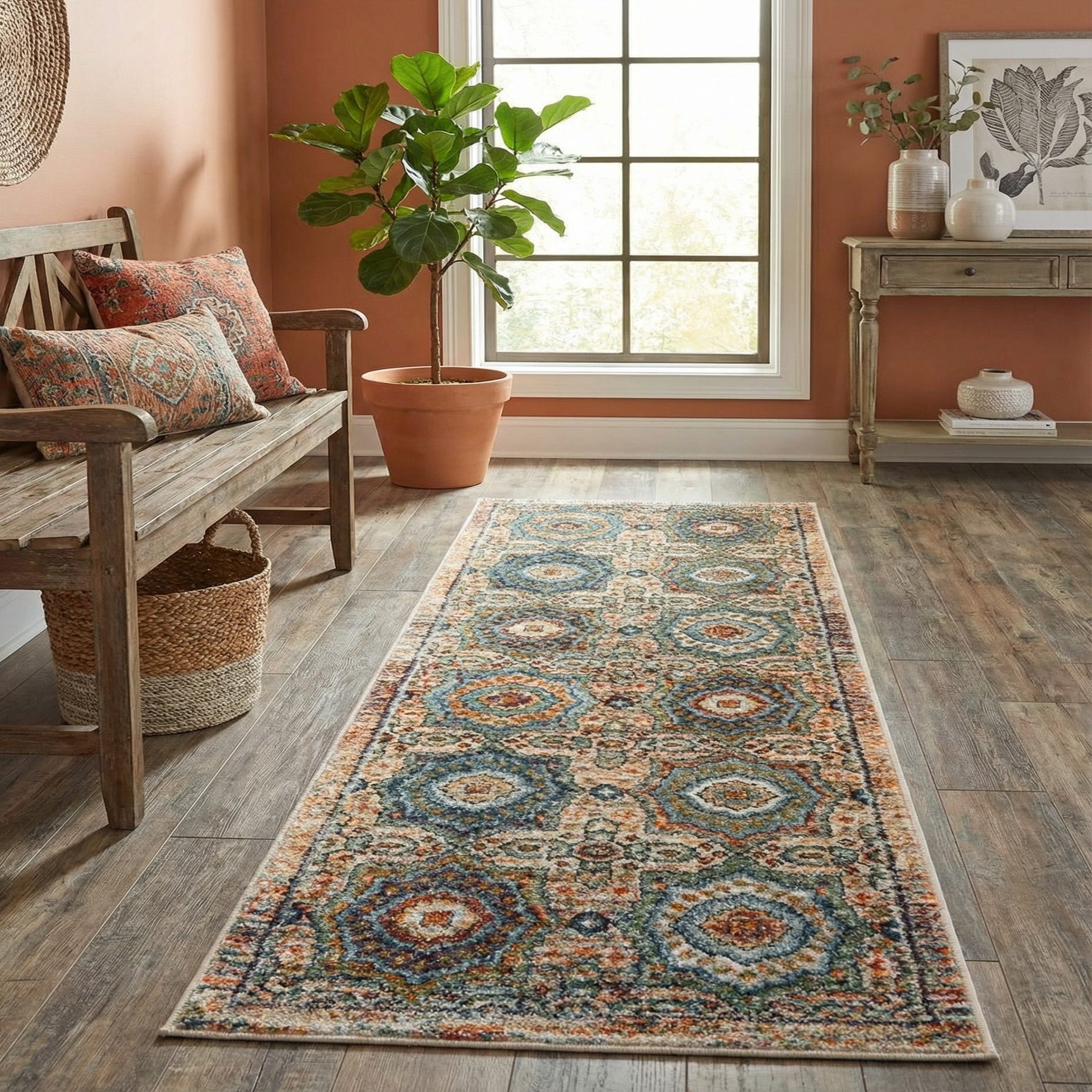 Primary color is Multi. Colors in this rug include: Multi, Beige, Black, Blue, Green, Ivory, Light Blue, Navy Blue, Orange, Peach, Purple, Red.