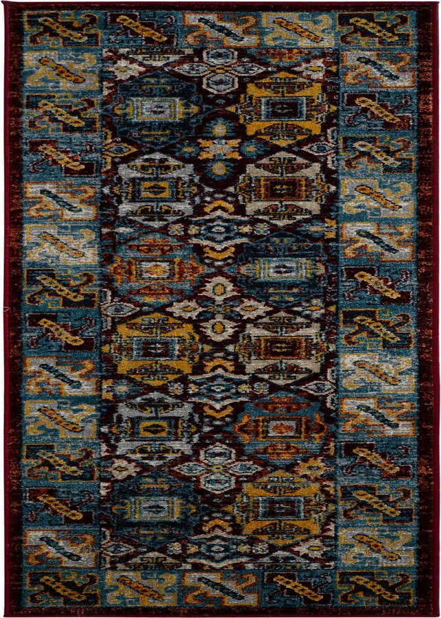 Primary color is Multi. Colors in this rug include: Multi, Black, Blue, Gray, Ivory, Red, Yellow, Beige.