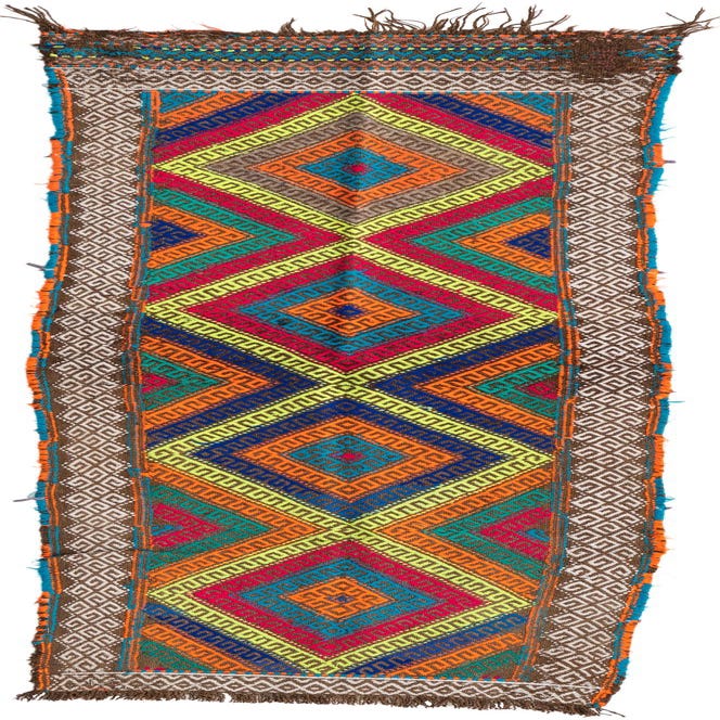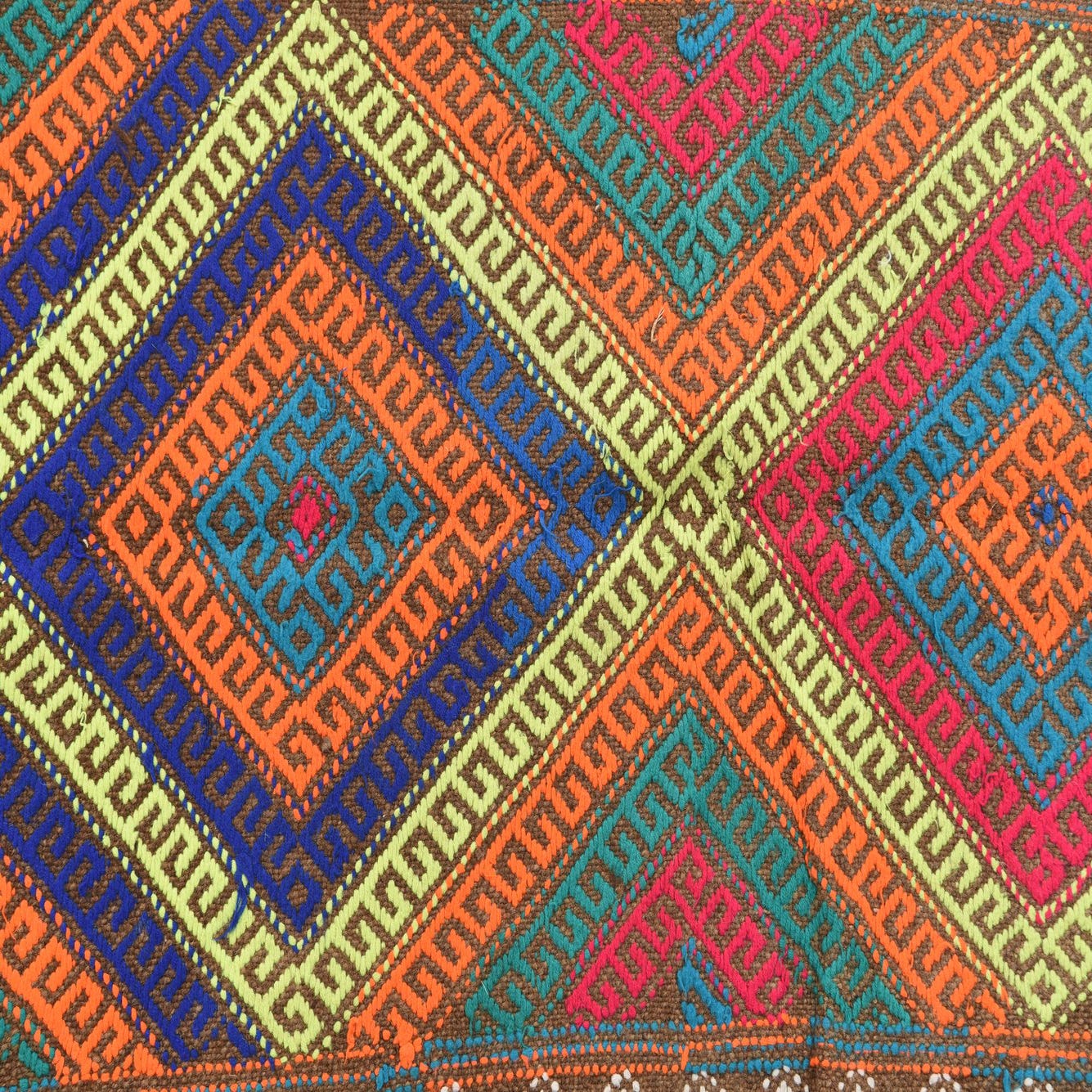 A stacked-field of bold diamond medallions drives the design, each formed by stepped, meandering lines that create a lively geometric rhythm. The multi-colored ground mixes earthy browns and beige with vivid accents of blue, green, orange, yellow and pink, while narrow guard borders with repeating diamond motifs frame the composition. The pattern balances energetic color shifts and crisp, angular motifs for a look that references traditional kilim geometry with a vibrant, contemporary palette.