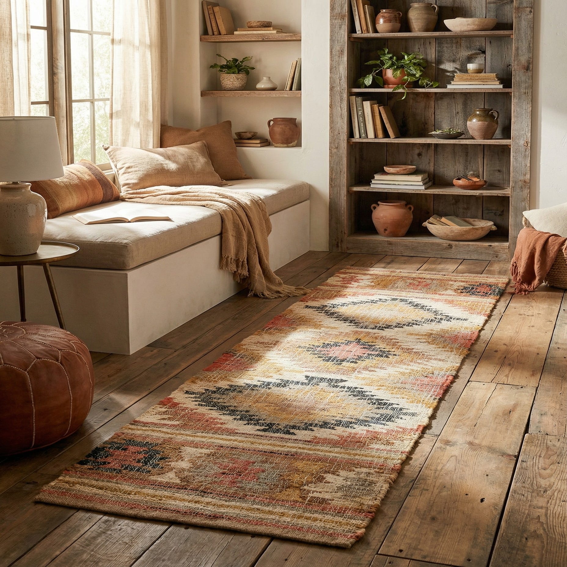 The Kilim Jute Runner brings a traditional touch to any living space with its handwoven construction, blending 95% jute with 5% cotton to create a durable yet comfortable underfoot experience. This 6 ft runner features a distinctive pattern characterized by geometric shapes and tribal motifs that are both bold and harmonious in design. The multi-colored palette incorporates beige, black, ivory, and rust red hues set against a multi-colored background, offering versatility to complement a range of color schemes.