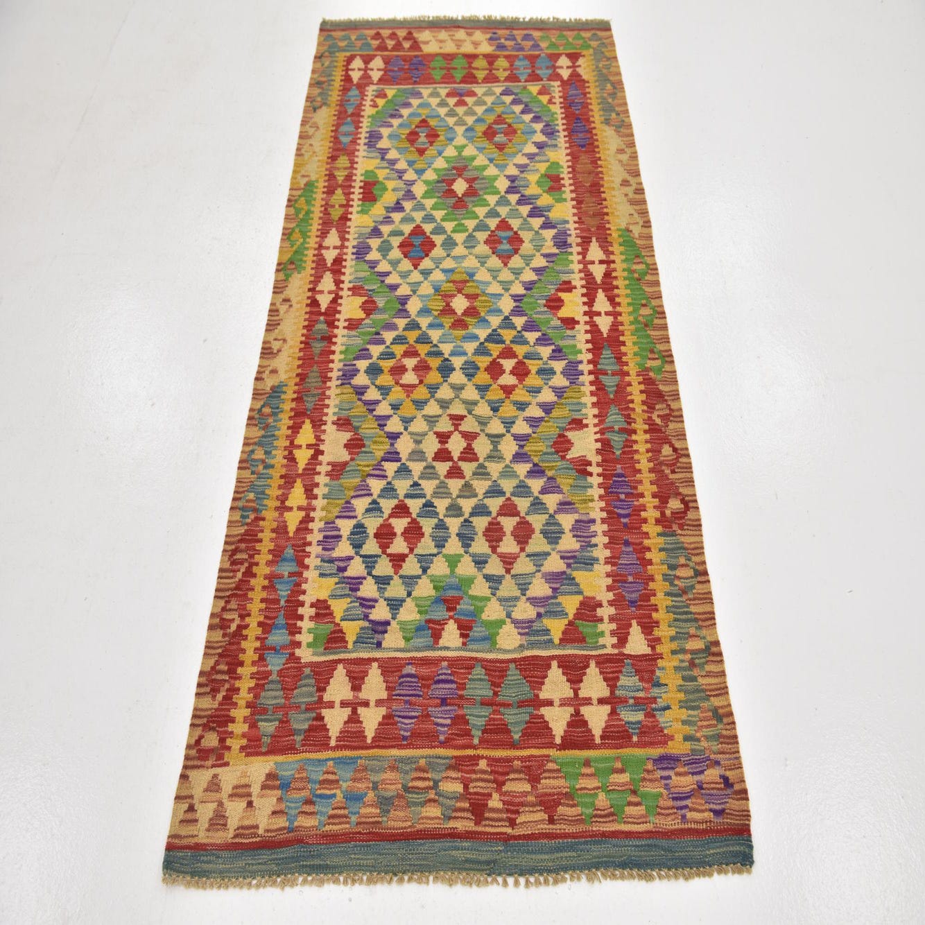 The Kilim Maymana collection presents a hand-woven 6 Ft runner crafted from 100% wool, ideal for adding a touch of artisanal charm to any interior space. Showcasing a diverse color palette, this runner includes blue, cream, gold, green, red, violet, pink, and olive hues set against a multi-colored background, which together create a visual tapestry that can harmonize with a variety of decors. The woven texture and fringe at both ends add tactile interest and a traditional feel.