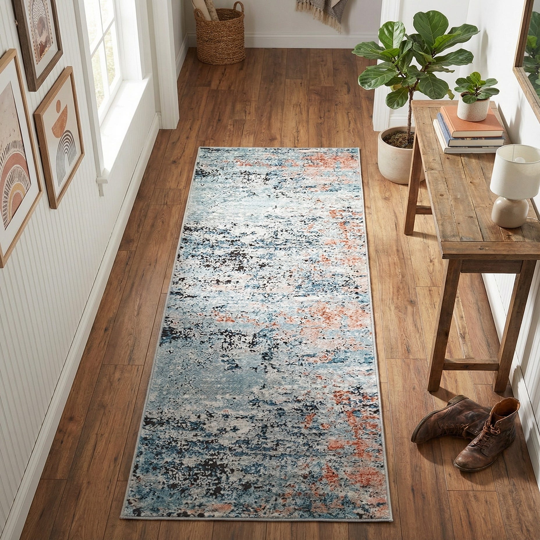 Machine made of 75% polypropylene and 25% polyester, this runner lays flat and keeps the palette consistent across its length. Its narrow format is ideal for hallways, entryways or a kitchen galley, and the color mix pairs well with coastal or contemporary schemes, light oak or gray floors, navy upholstery and warm peach or terracotta accents for contrast.