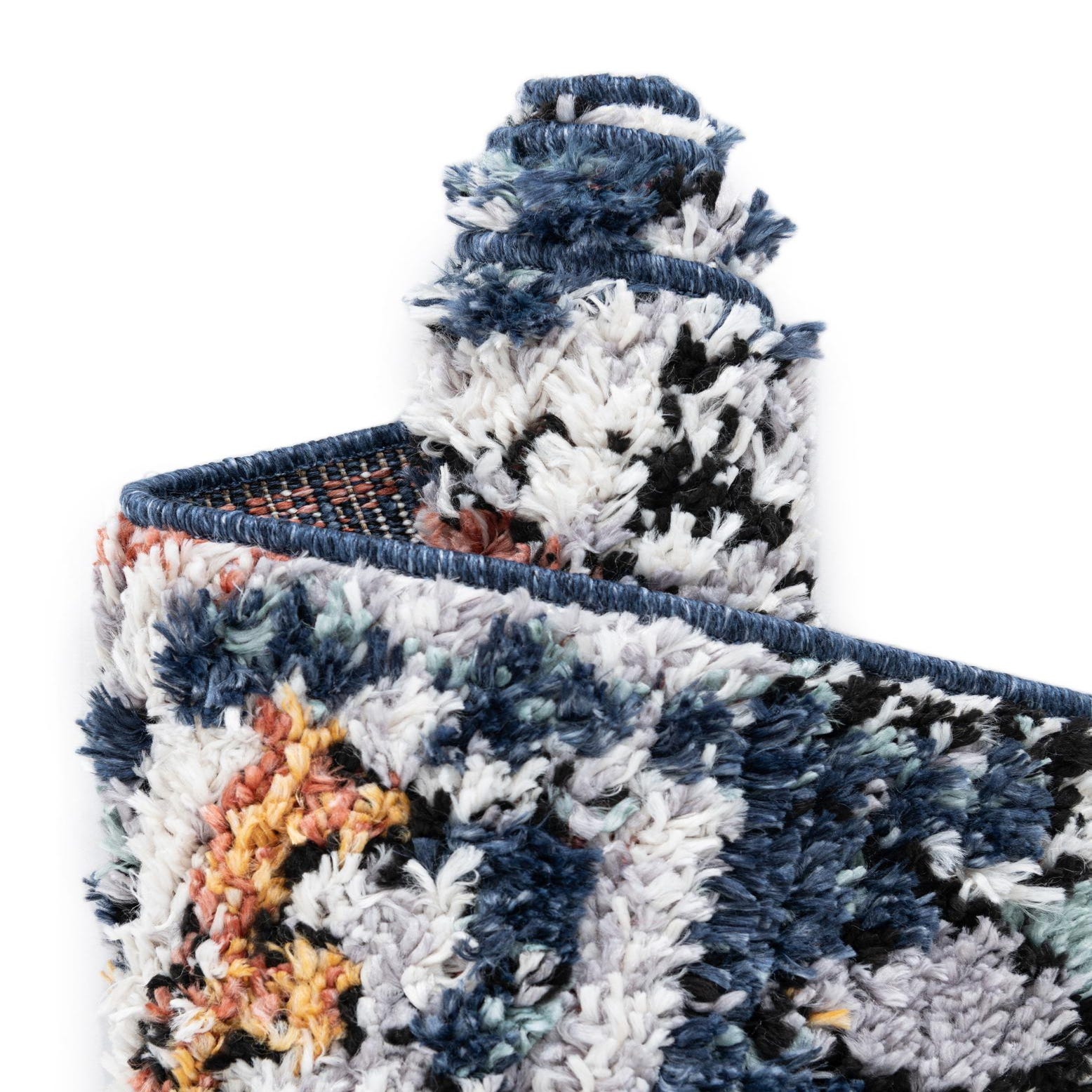 Use this runner to add color and texture to a hallway or entry, or place it alongside a bed for a cozy, decorative strip underfoot. It pairs well with warm wood tones and mid-century shapes that echo the navy and rust accents, or with neutral upholstery where the rug becomes a subtle focal point; matte black or brushed brass hardware will pick up the darker and warmer highlights. The look suits contemporary, transitional, and eclectic interiors that welcome layered pattern and color.