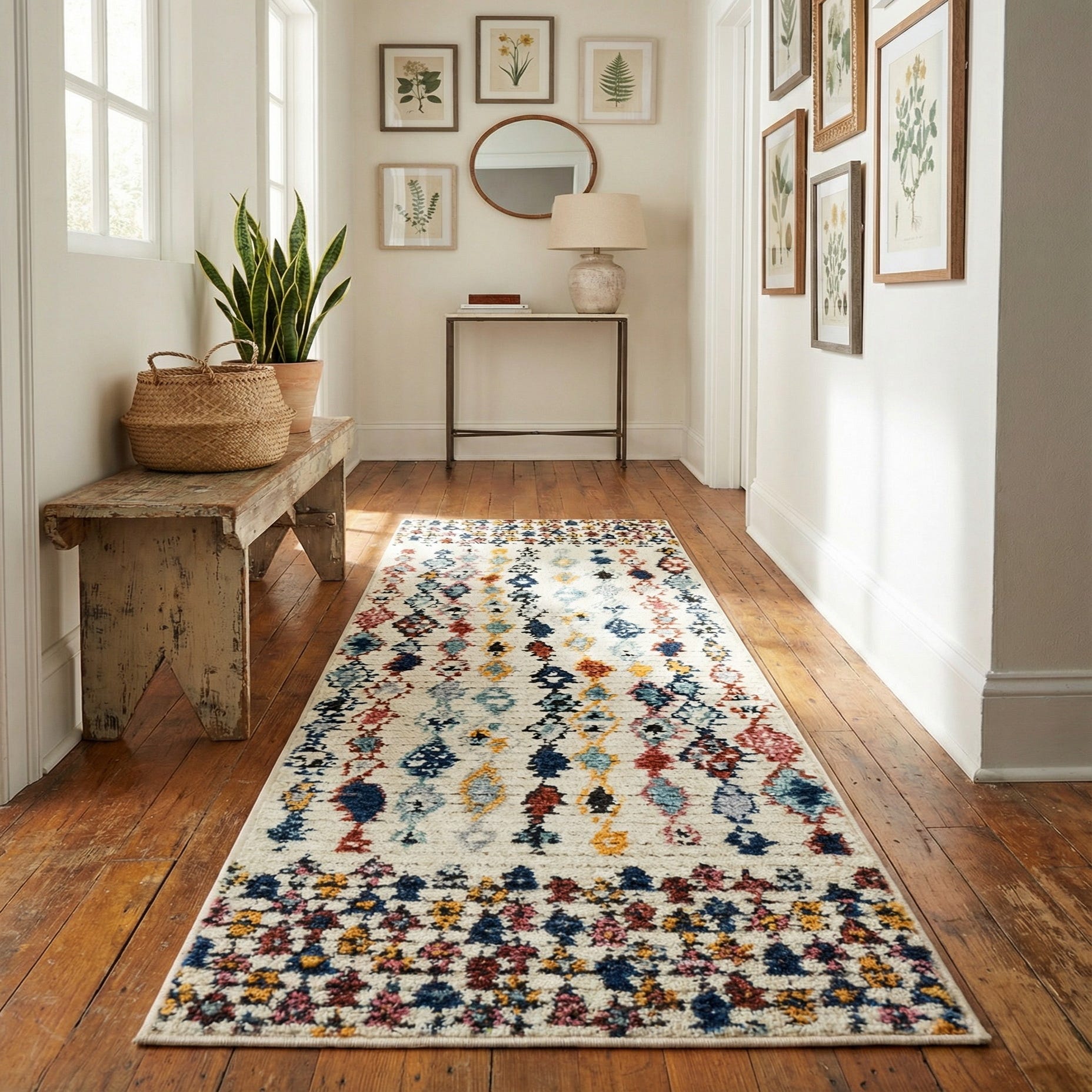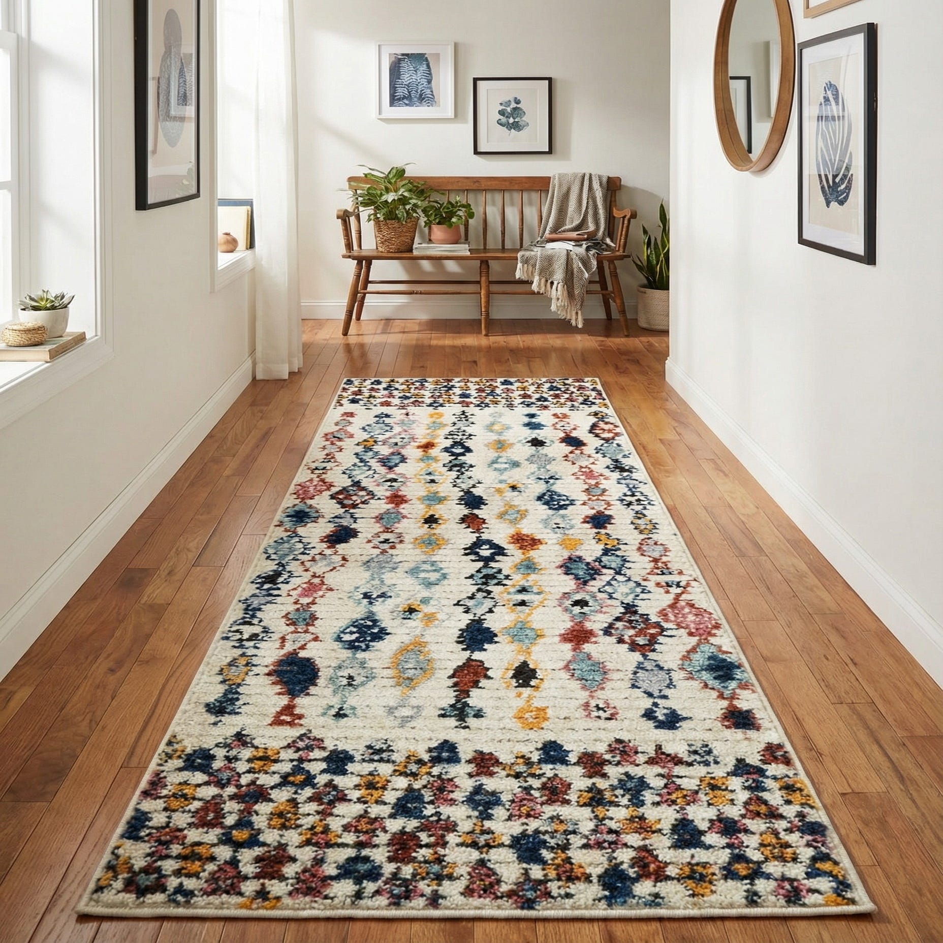 Machine made from 100% polyester, the pile is soft and slightly cushioned underfoot while maintaining clear, saturated color. This runner works well in narrow or transitional spaces — think hallways, entryways, or kitchen aisles — and can anchor a layered bedroom vignette or add pattern to a casual living area. Pair it with light or medium wood tones, simple neutral upholstery, and woven accessories for a relaxed, bohemian or eclectic interior; it also complements clean-lined contemporary furnishings when you want a splash of color and texture.