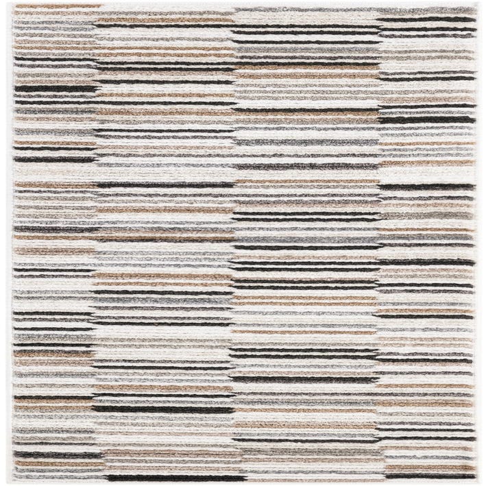 A 6 ft runner rug featuring a modern stripe pattern in multi-colored hues of white, black, brown, and gray, ideal for a hallway.