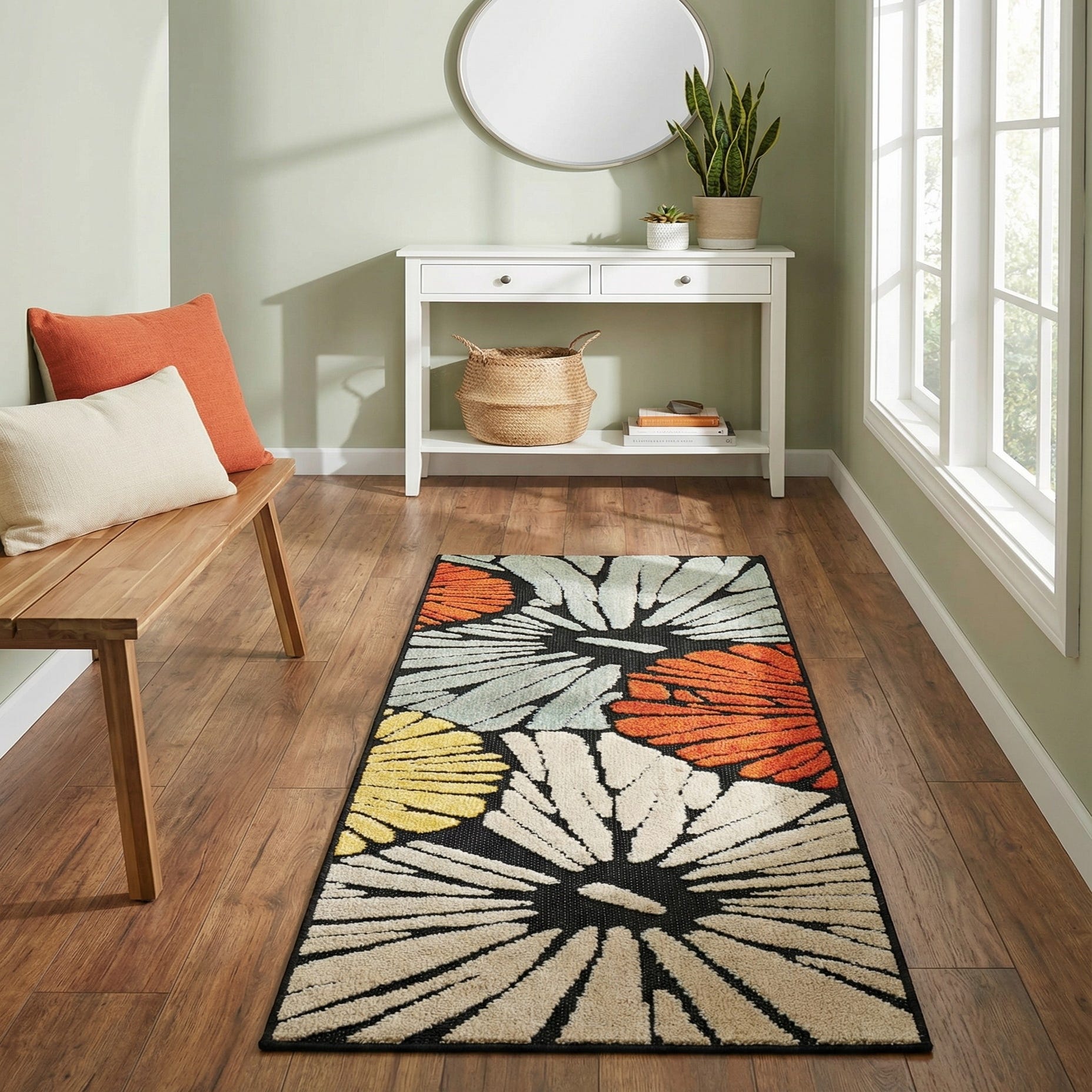 A 6 ft runner rug with a modern floral pattern in orange, light blue, yellow, and cream on a black background.