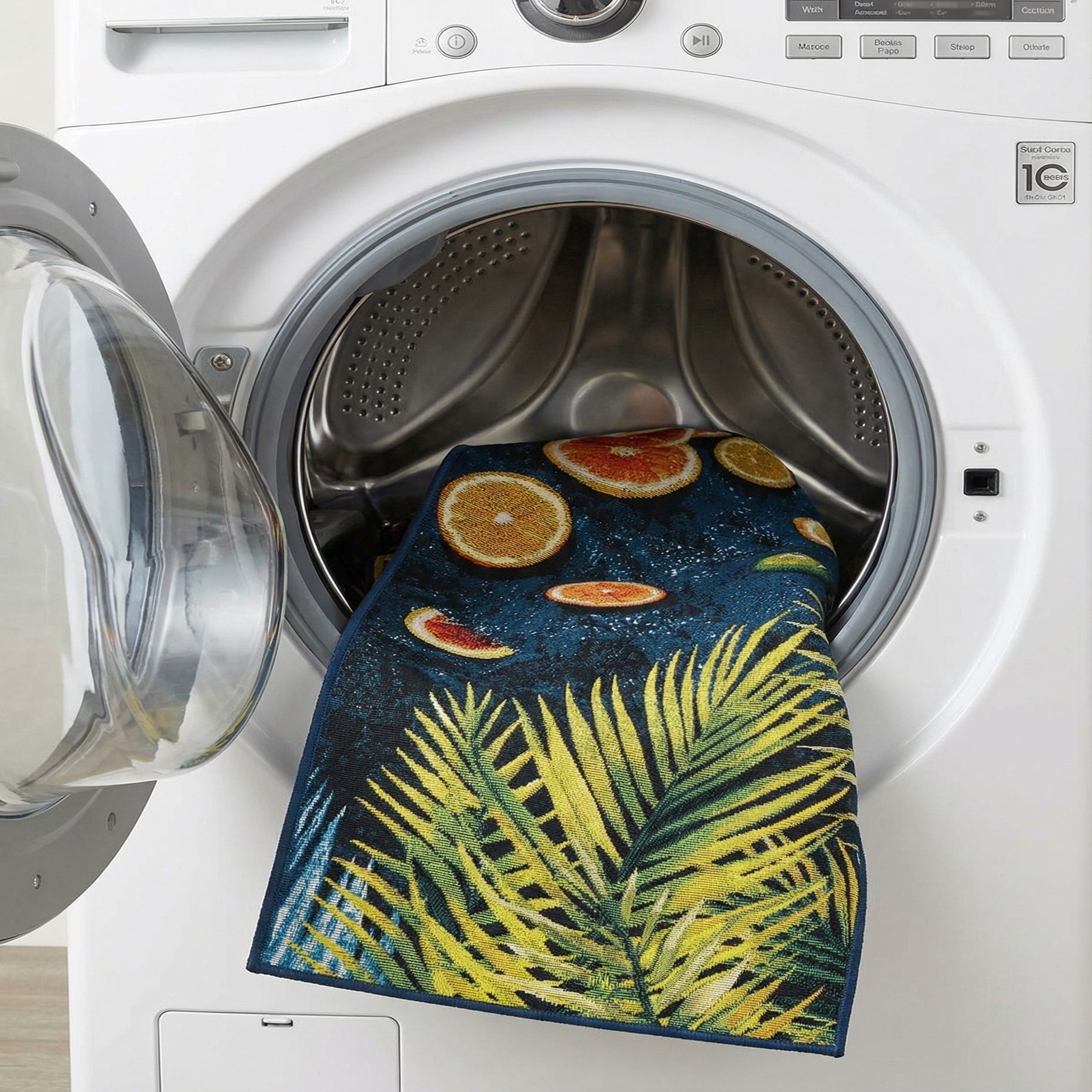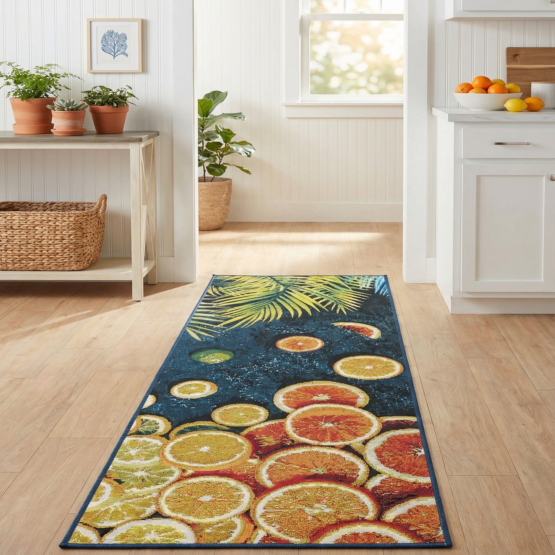 A vibrant multi-colored runner rug featuring a modern abstract design with green palm fronds and various citrus fruit slices on a dark blue background.