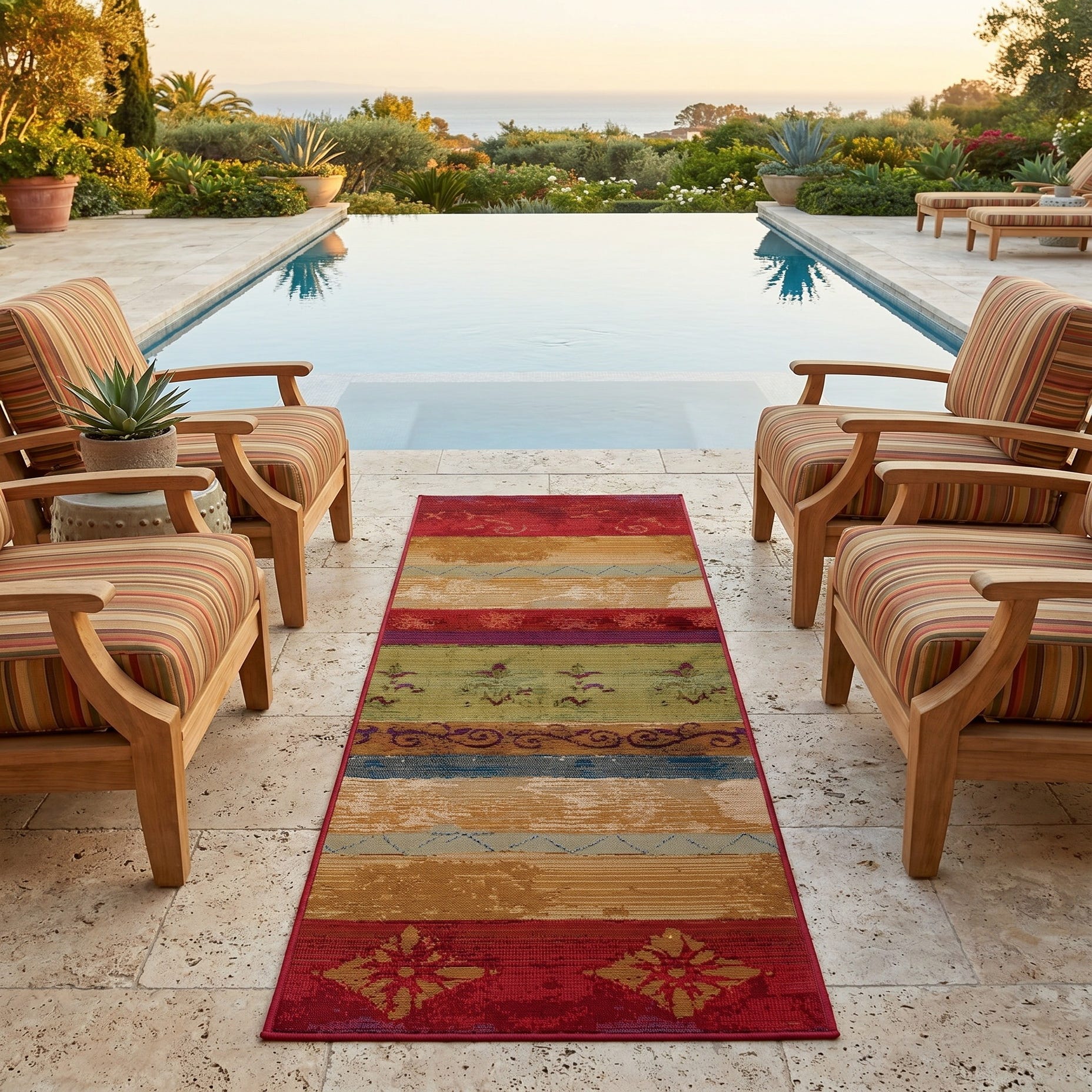 Fell in love with this rug when I saw it on-line for its delightful pattern and vivid colors. It arrived in two days from the day ordered about a week ago. We put it down on our renovated deck today...it is even more awesome than we thought it would be! The colors and pattern outset the colors of the deck perfectly.