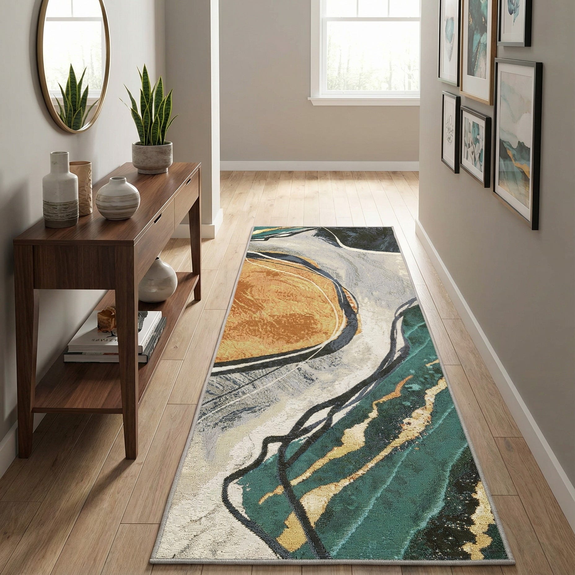 This piece works well in modern and transitional settings where a graphic runner can define a path or add a focal stripe of color. Place it in an entryway or hallway to guide traffic, layer it on a covered patio or sunroom to introduce color, or use it alongside natural wood furniture and navy or ivory textiles to echo its palette. It also pairs nicely with matte black metal accents or brass hardware for a contemporary edge without overpowering surrounding decor.